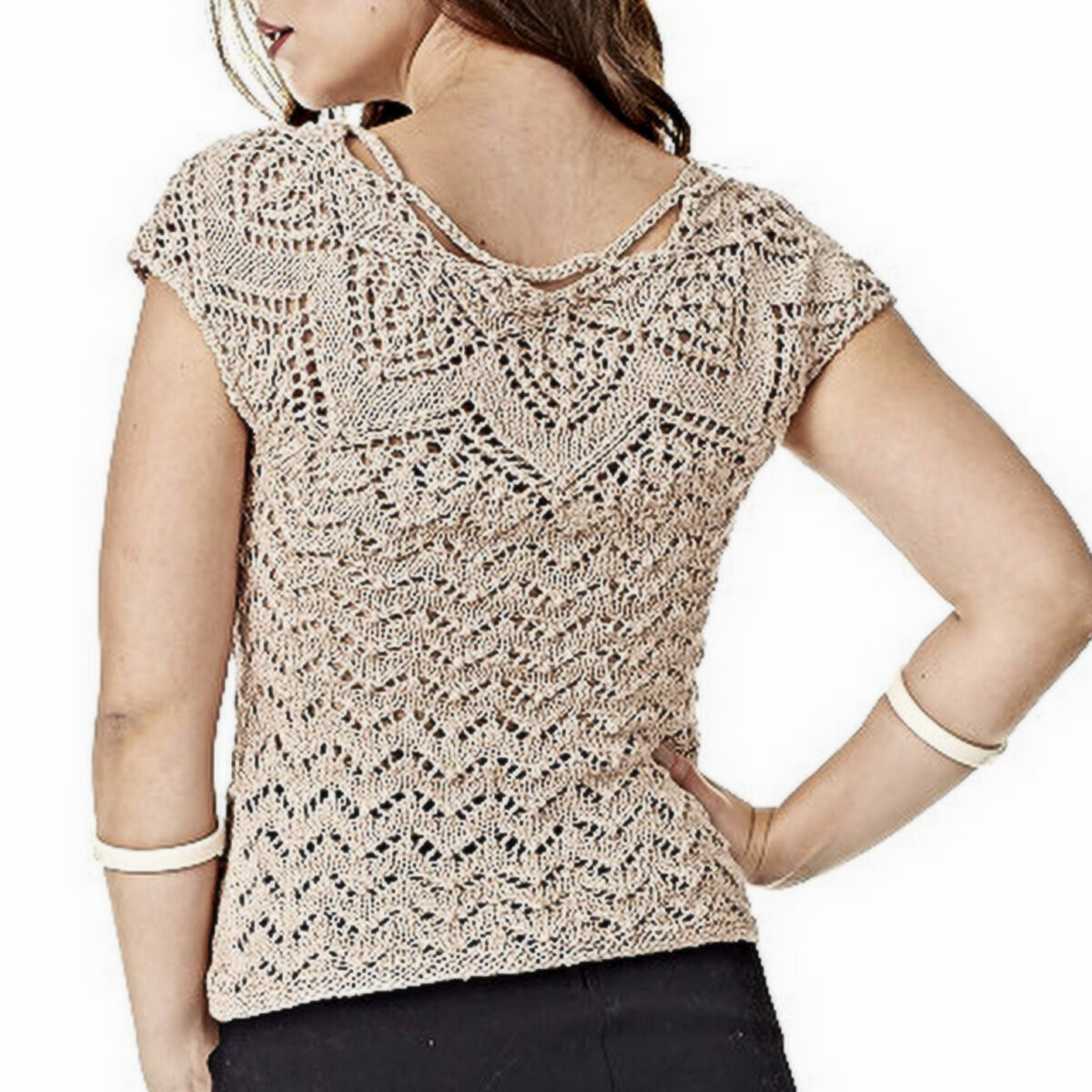 Светло-бежевый топ спицами с эффектной ажурной кокеткой. Прямой, слегка облегающий фасон, круглый вырез горловины, небольшой спущенный рукавчик за счёт кокетки и необычное оформление ворота воздушной цепочкой.