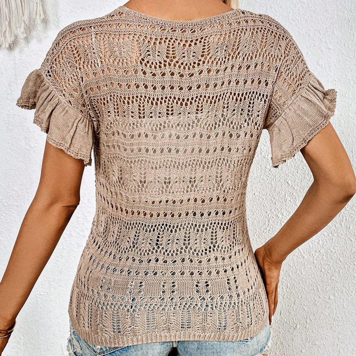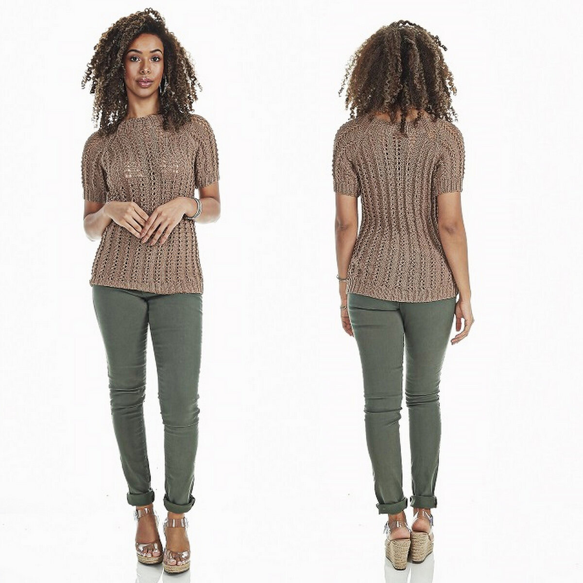 Стильный тёмно-бежевый топ спицами с простым узором из ажурных дорожек. Прямой фасон до бедер, короткие рукава-реглан и небольшой круглый вырез горловины.