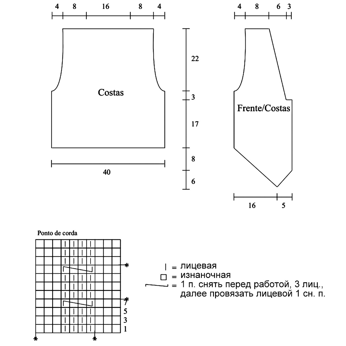 Прямой фасон до пояса, небольшие убавления под проймы и V-образный вырез горловины.