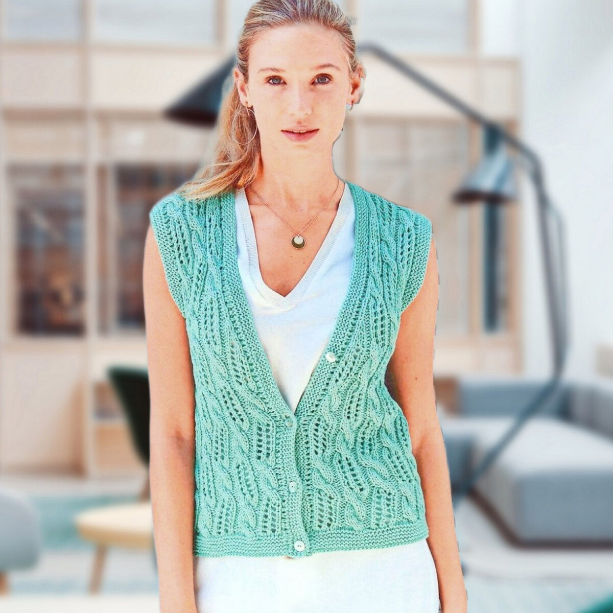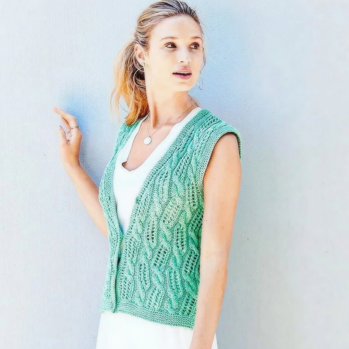 Стильный мятный жилет. Элегантная женская модель с фактурным узором из жгутов и ажура, рельефная отделка из платочки по краю. Жилет застёгивается на пуговички.