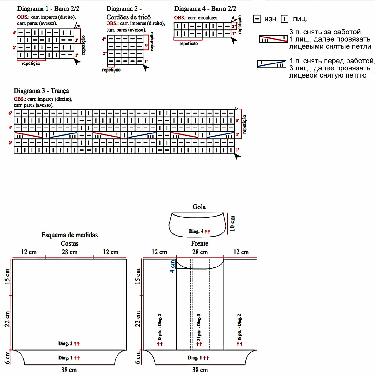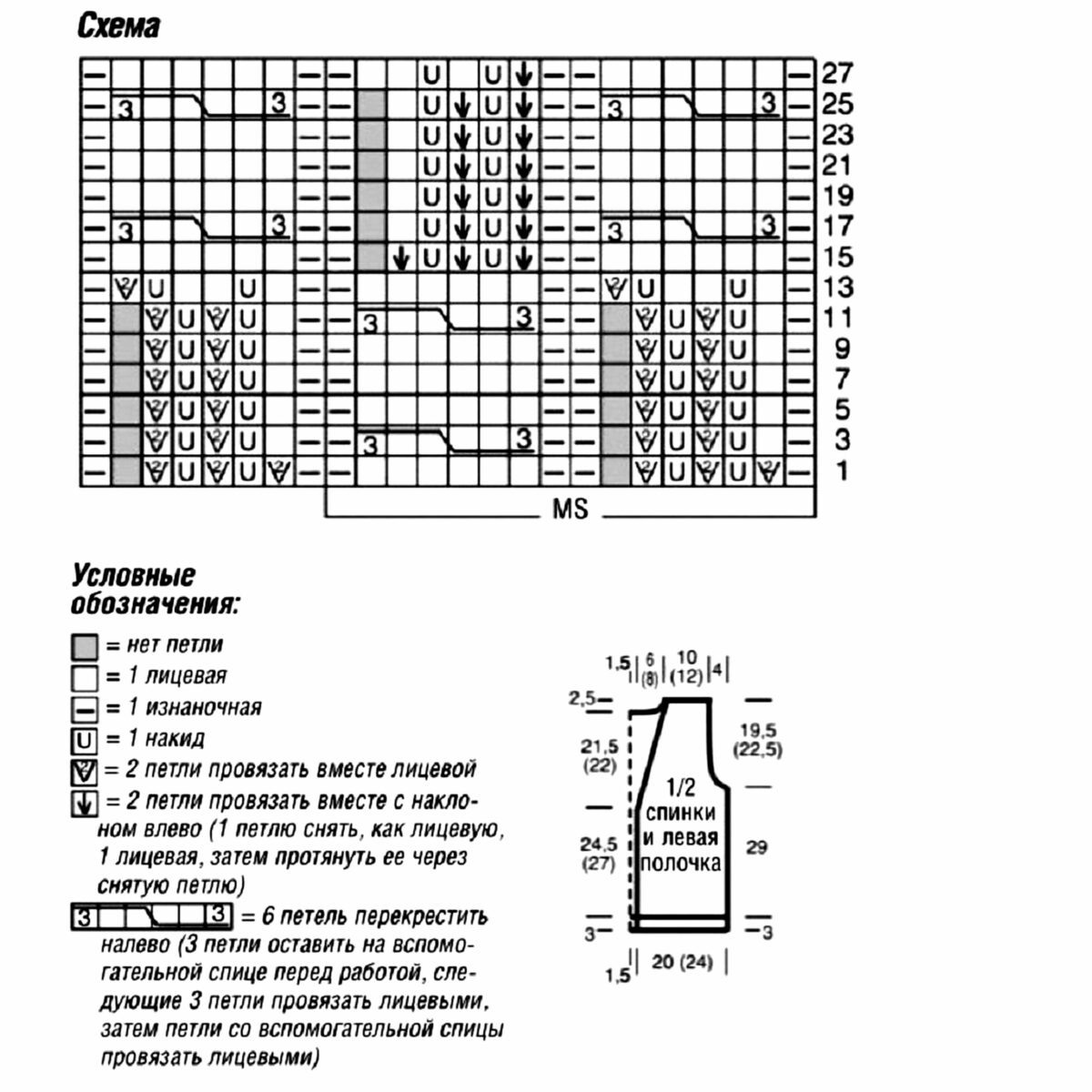 Внимание! Вертикальных полосах узора чередуются участки сетчатого узора и «косы». В начале каждого участка сетчатого узора в 1-м ряду согл. схеме убавляется 1 петля и в последнем ряду вновь прибавляется. Это сокращение числа петель на отдельных участках не учтено в данных о петлях в инструкции. Данные постоянно относятся K первоначальному числу петель, которое насчитывается после каждого 13-го и 14-го и 27-го и 28-го рядов узора. Узор 3: лицевая гладь = лицевые ряды — лицевые петли, изнаночные ряды изнаночные петли.