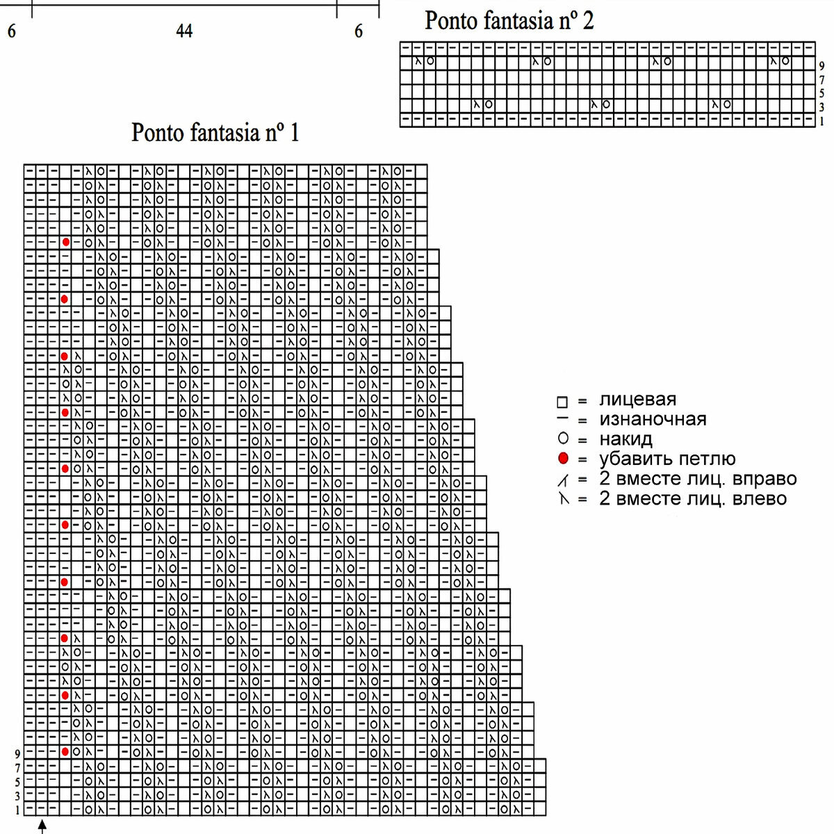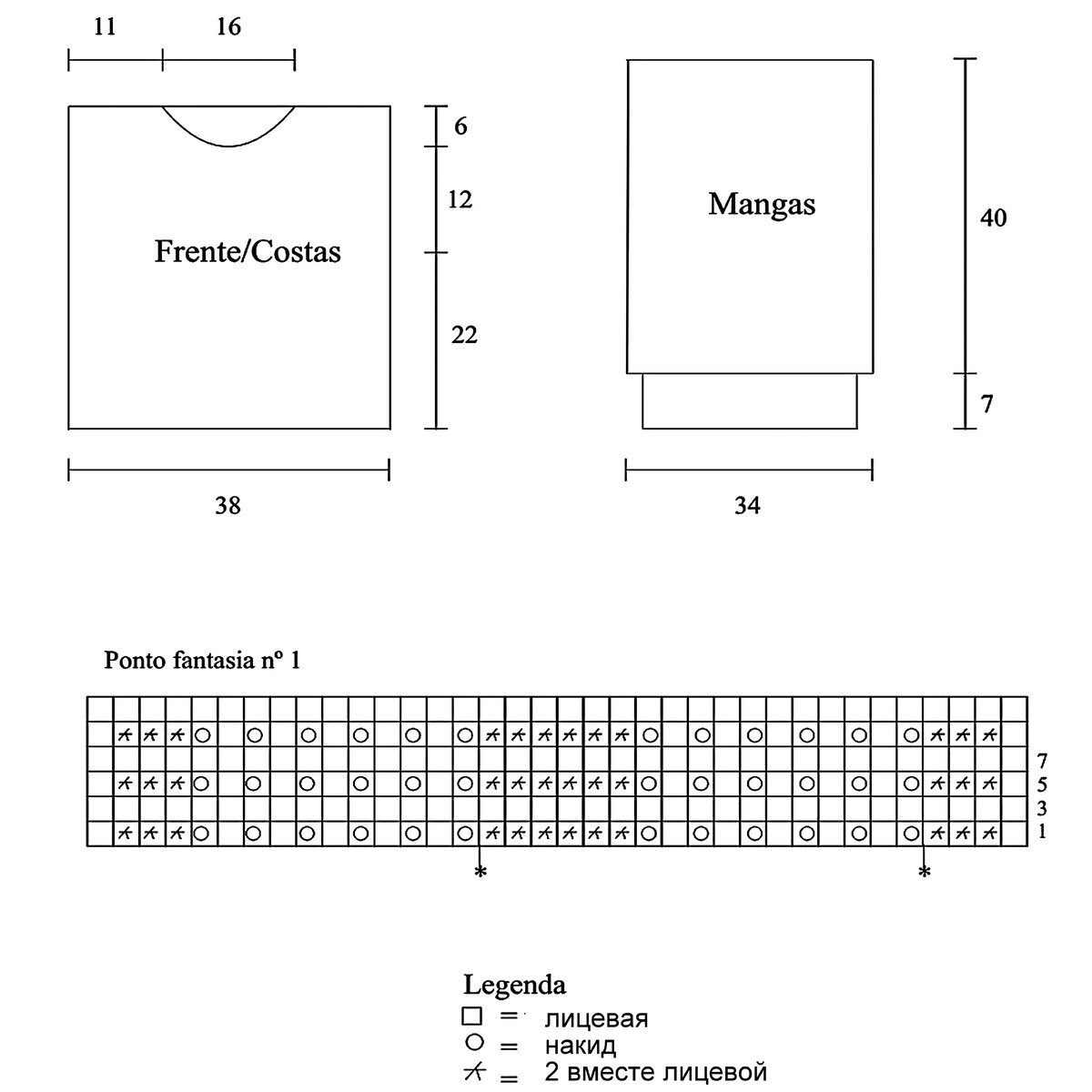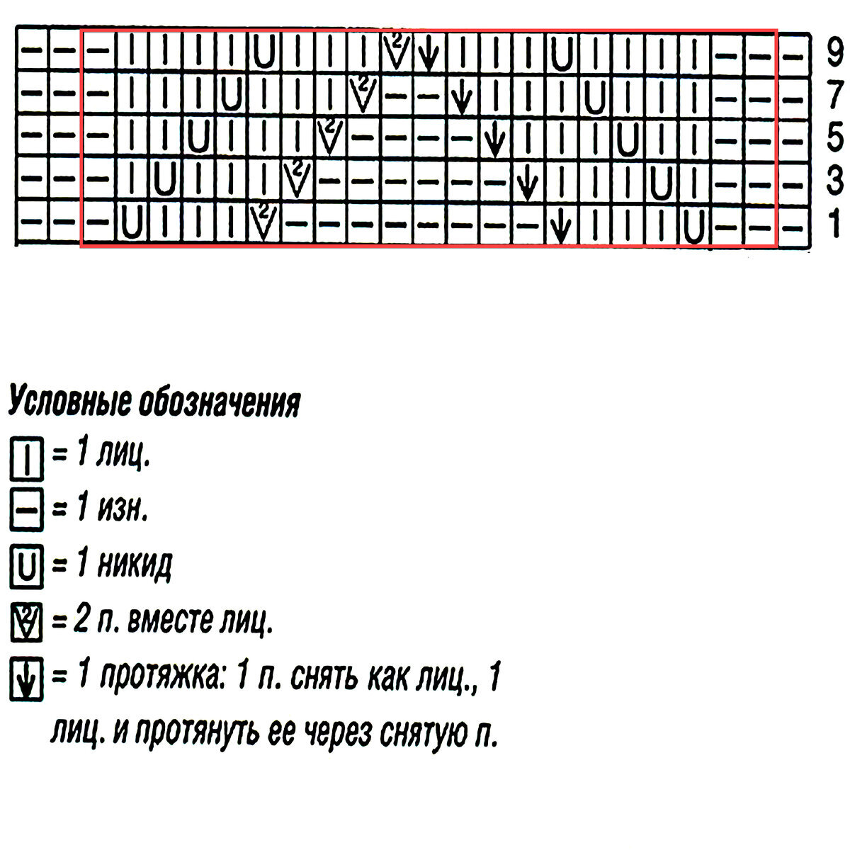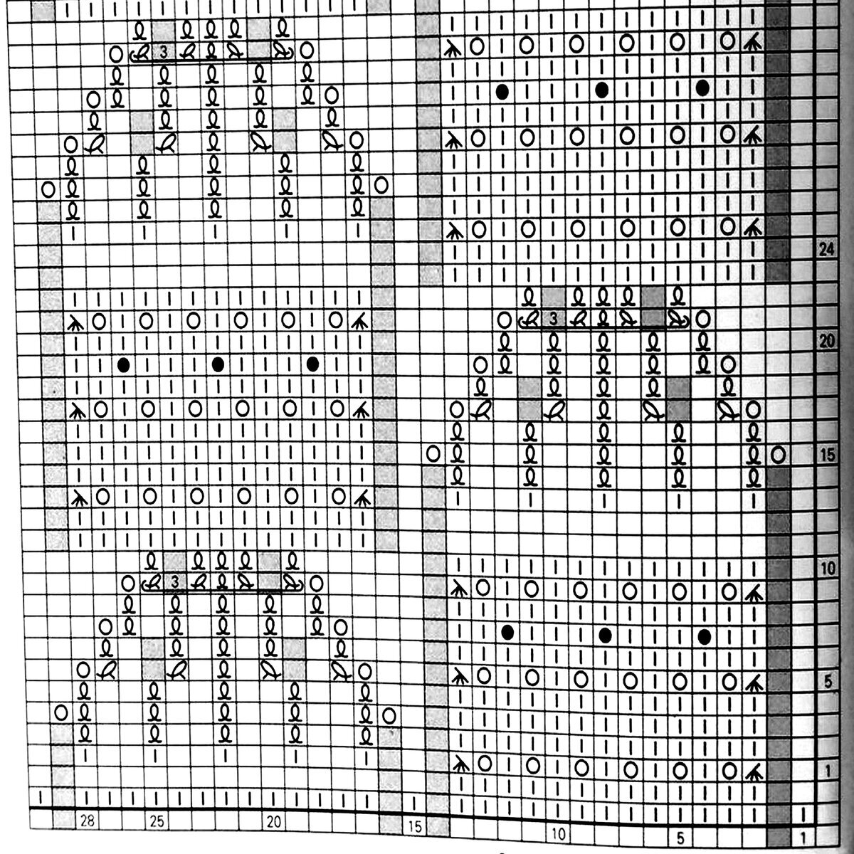 Раппорт узора 28 петель и 22 ряда в высоту. На схеме указаны и лицевые, и изнаночные ряды.