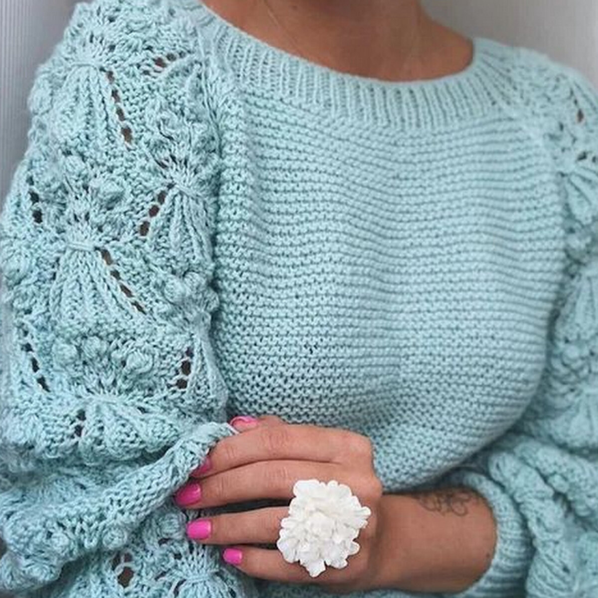 Нежно-бирюзовый джемпер спицами, связанный простой лицевой гладью (можно связать как регланом сверху, так и регланом снизу). Вся изюминка в ажурных рукавах!