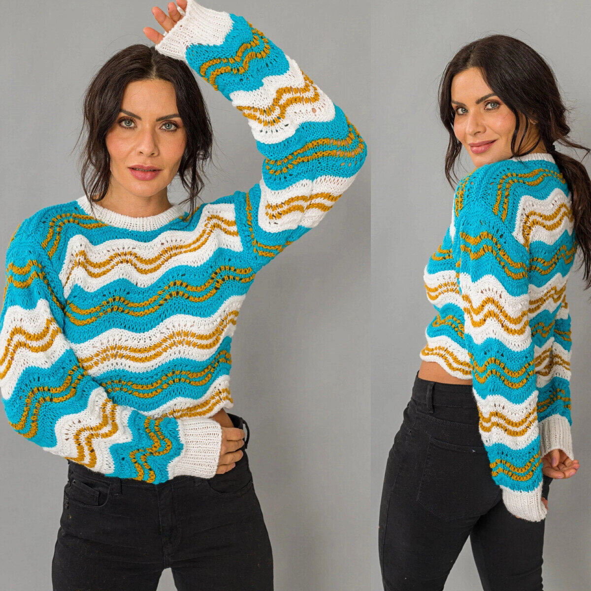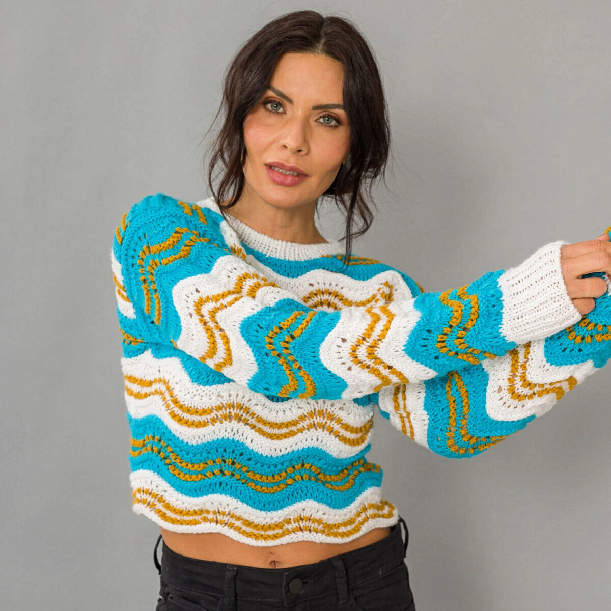 Очаровательный бирюзовый джемпер крючком с глубоким вырезом горловины, кокетливо оголяющим плечики.