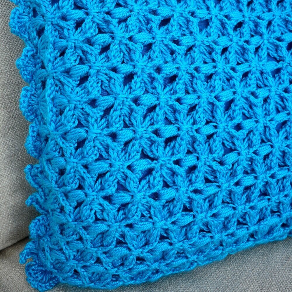 Насыщенно-синяя подушка крючком с рисунком, лично мне напоминающим звёздочки.