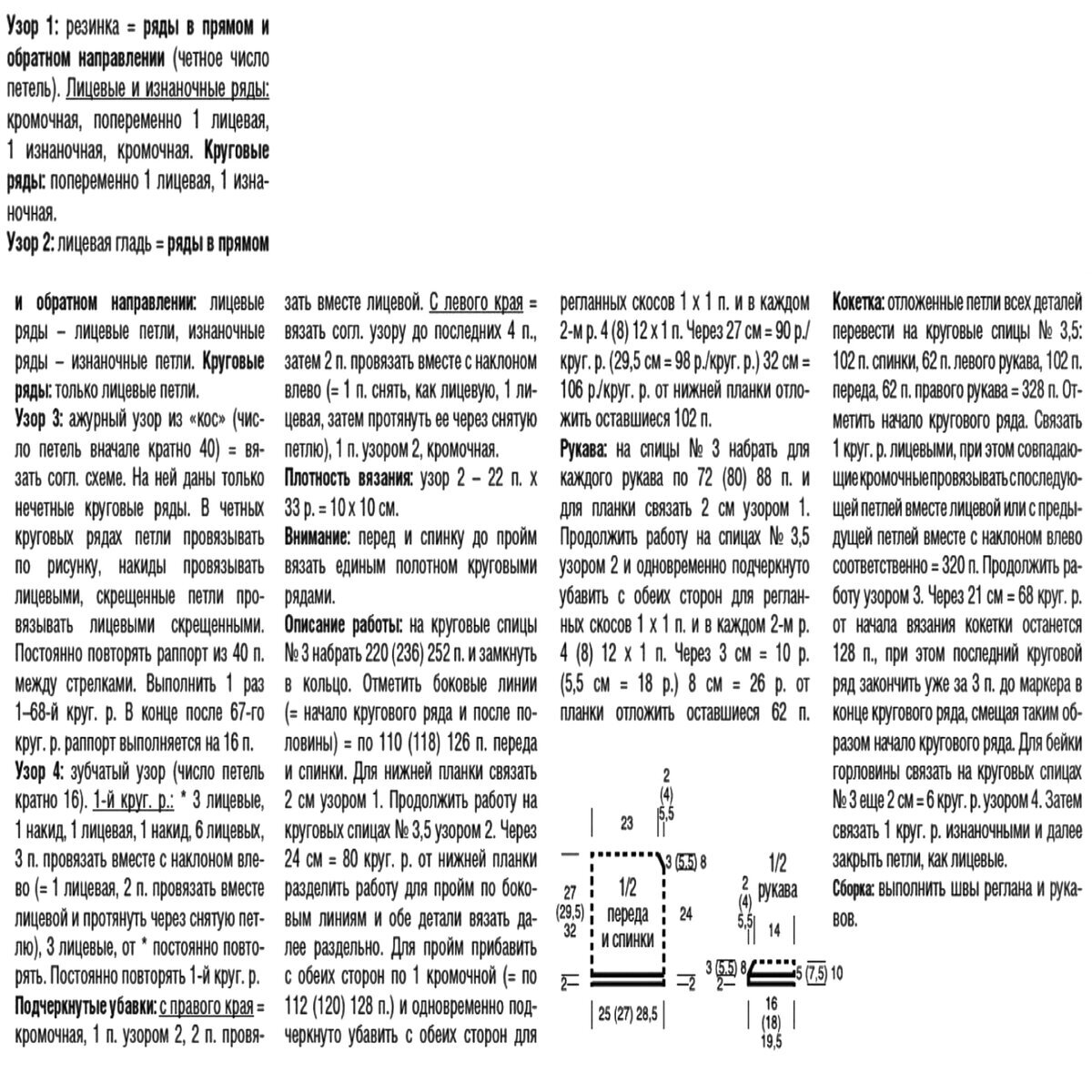 Для резинки 2х2, которая идёт внизу, на «крылышках» и вороте, используем спицы № 4, для остального узора № 5.