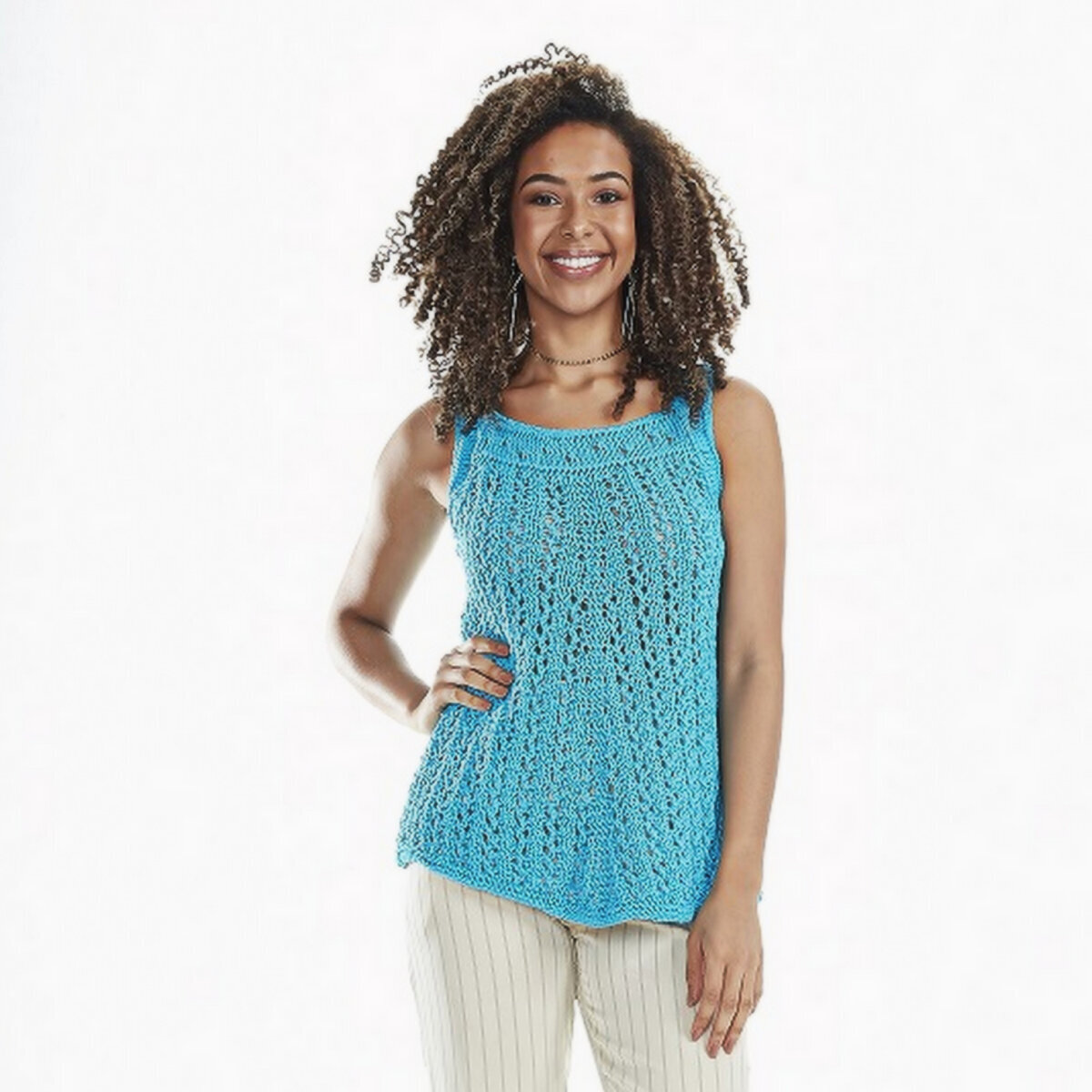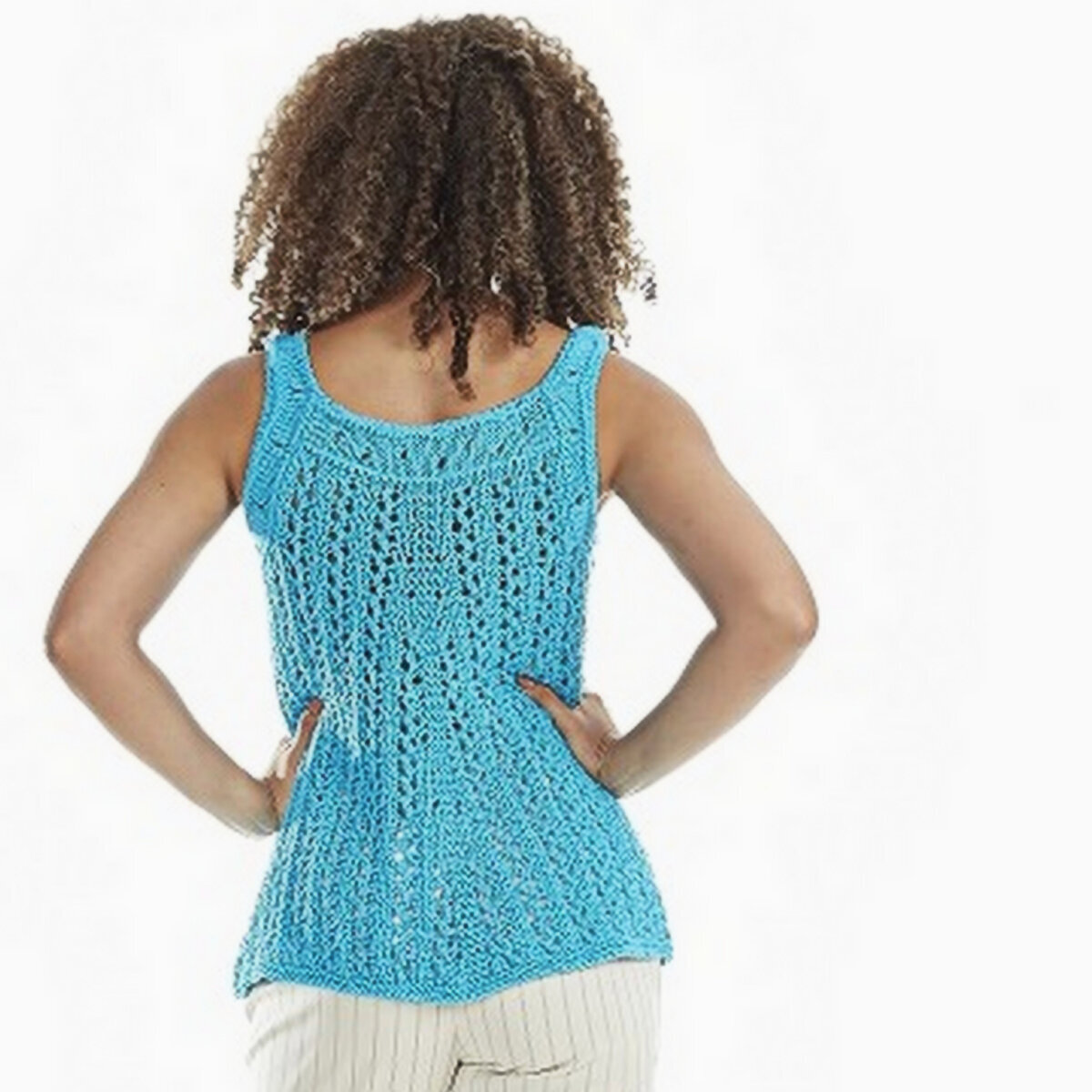 Ажурный летний топ спицами интересного кроя. Трапециевидный фасон, широкие лямочки, овальный вырез горловины.