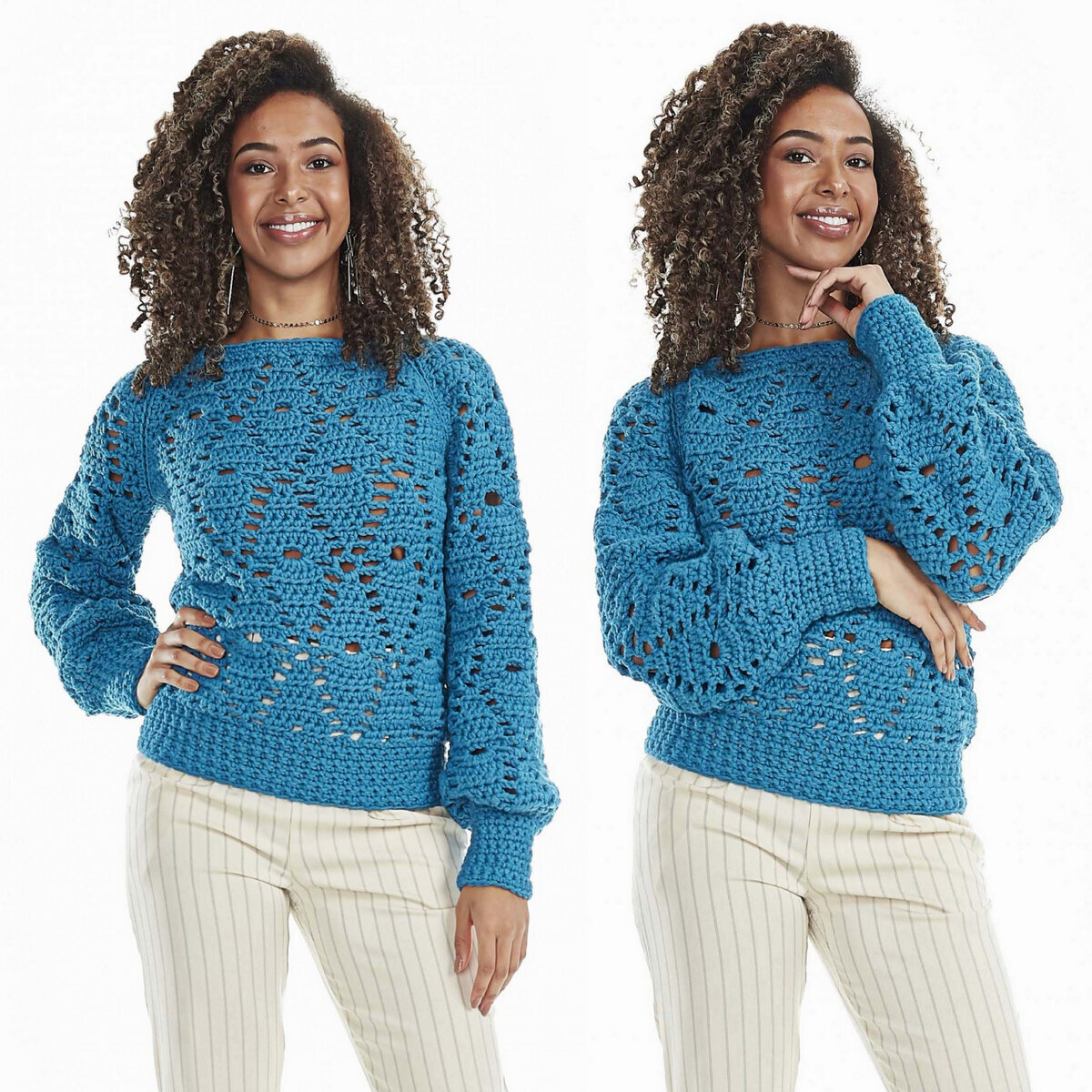 Тёмно-бирюзовый джемпер с крупным ромбовидным узором крючком — такая модель отлично подойдёт и для зимы! Прямой фасон до бедер, широкие рукава-реглан на узкой манжете-резинке и небольшой вырез лодочкой.