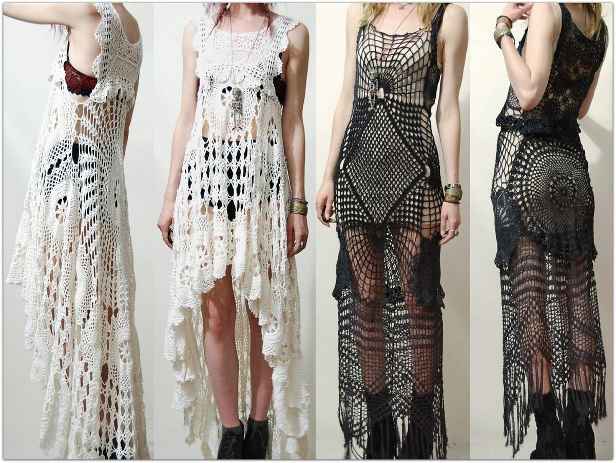 Очень нравится вот эта белая туника, связанная из цветочных мотивов, с асимметричным подолом. Если подобрать к этой тунике непрозрачный подклад, то можно носить и как платье.