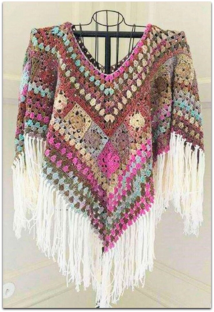 Вот такое сказочное пончо с богатой бахромой, выполненное все тем же простым бабушкиным квадратом. Хоть модель и яркая, цвета всё-таки не кричащие, а приятно-приглушённые. Белая бахрома добавляют образу особую нарядность. Надеть какой-нибудь простой бежевый или коричневый (в тон основного цвета пончо) топ, обычные джинсы-скинни и высокие казаки — шикарный образ стильной и современной модницы готов! ☺
