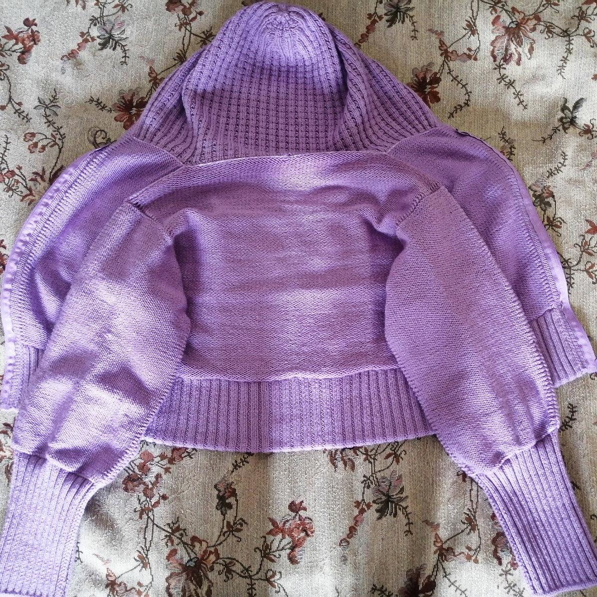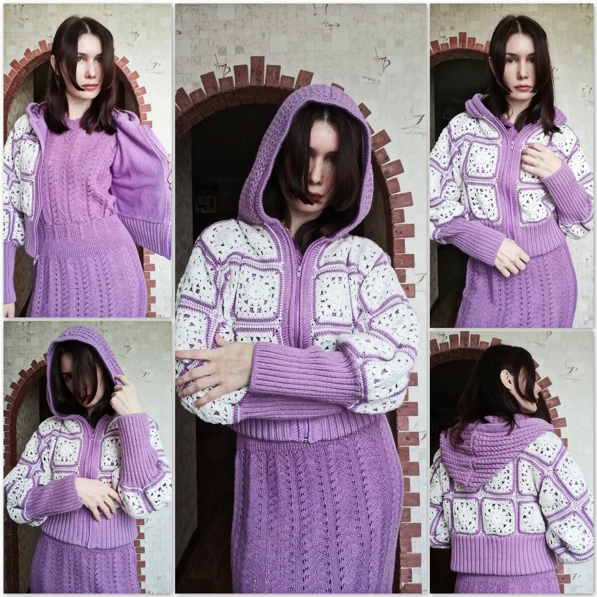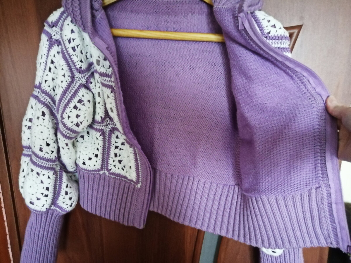 На этом вязание крючком заканчивается, переходим к спицам — отделка по низу, манжеты и капюшон связаны сиреневой пряжей в две нити, подкладка в одну нить.