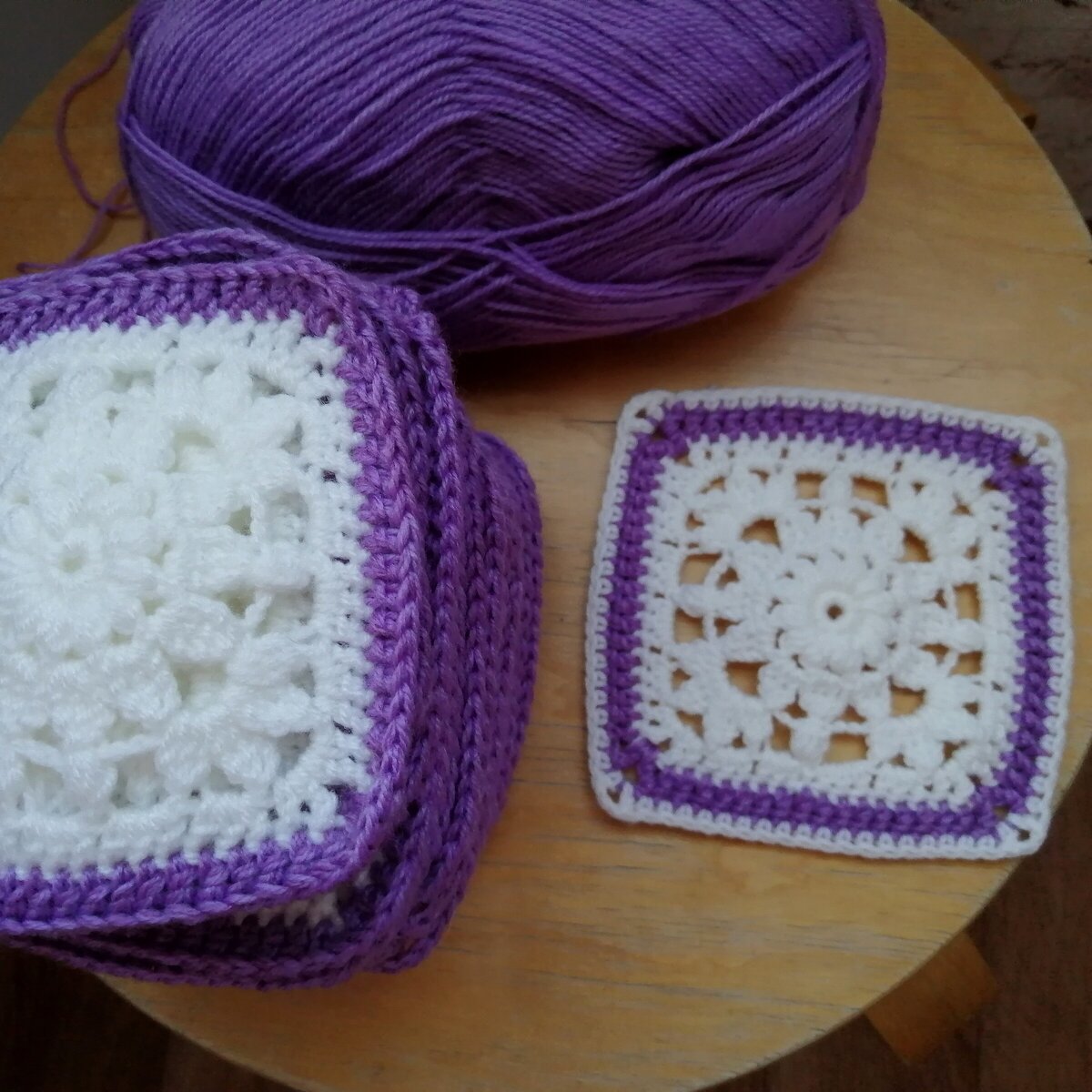 Белая часть мотива связана в одну нить, сиреневая — в две нити. Соединяла квадраты крючком с помощью тамбурного шва (причём лицевая его часть пошла на изнанку) сиреневой пряжей в две нити. Простой и красивый вариант соединения мотивов можно посмотреть в этом ролике