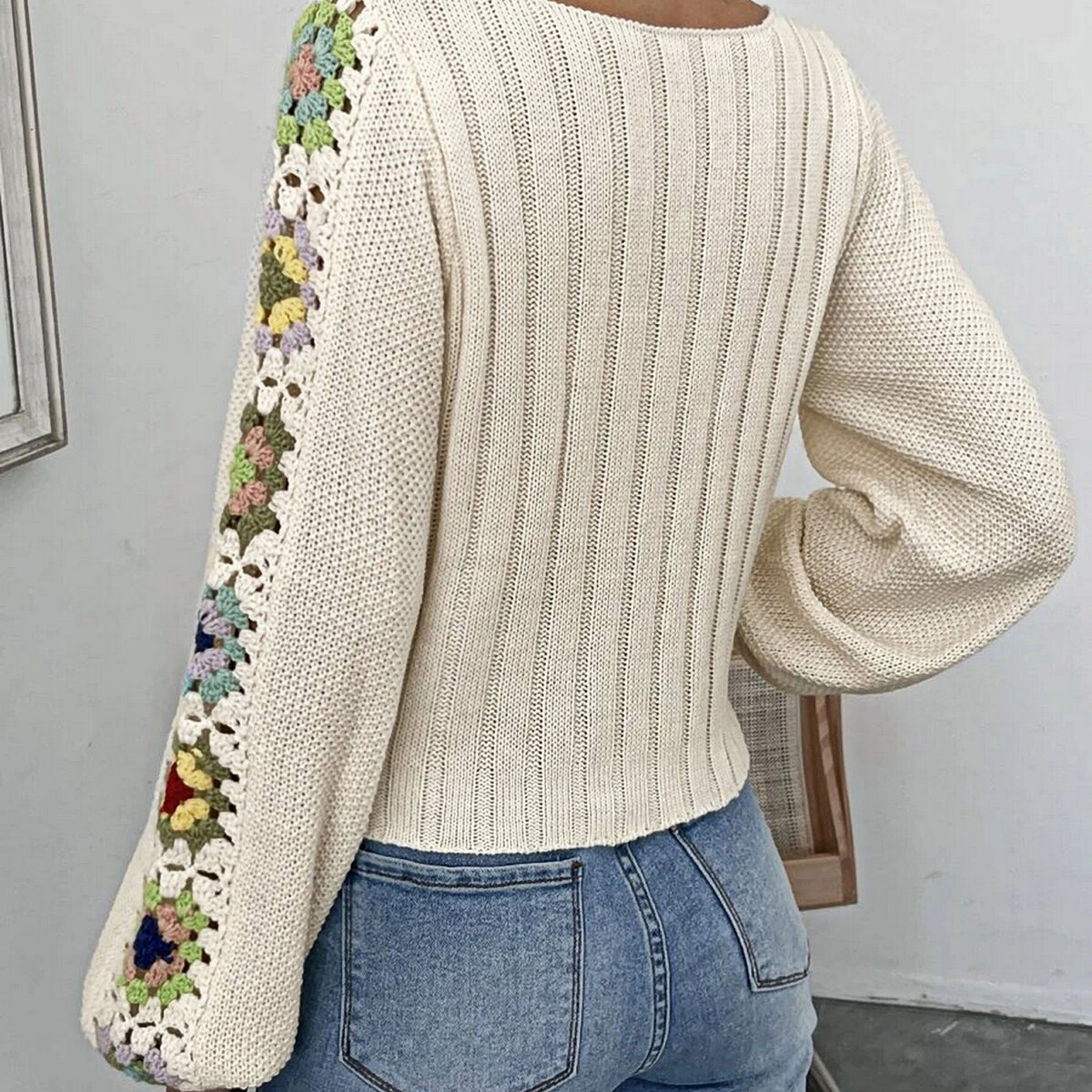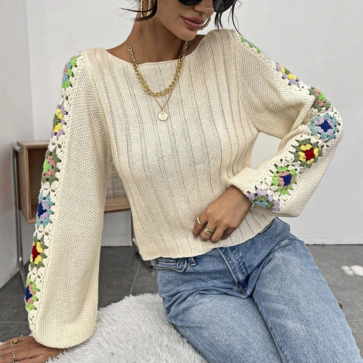 Эффектный джемпер в этно-стиле от китайского бренда Shein. Оригинальное сочетание классики и бохо — основная часть джемпера вяжется спицами, а на рукавах идут вставки из классических мотивов «бабушкин квадрат».