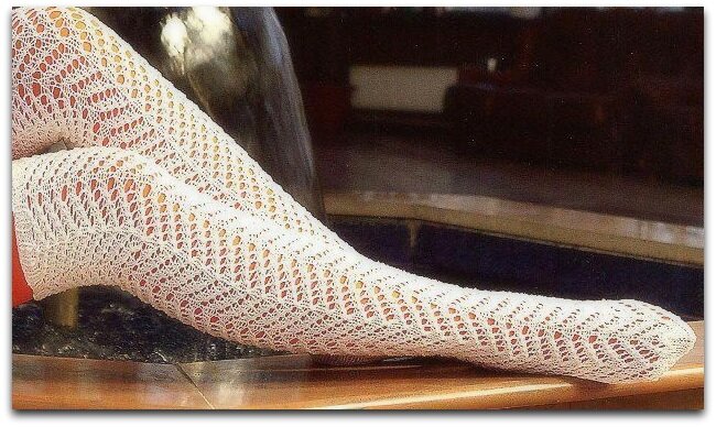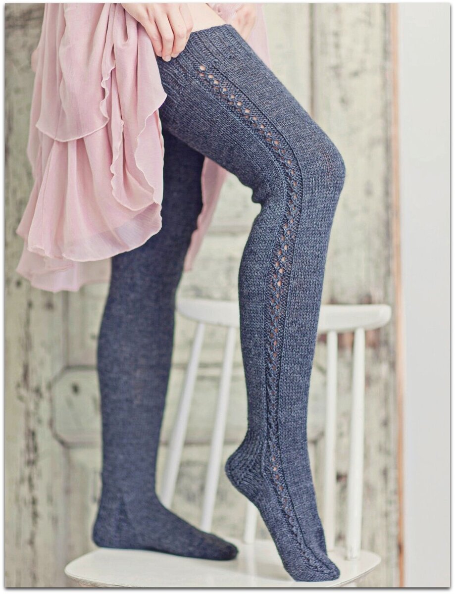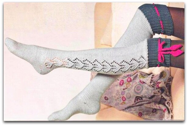 Если же на улице у вас не настолько тепло, чтобы ходить в очень «дырявых» гольфинах, а красивыми хочется быть всё равно — выход есть! Можно связать чулочки простой гладью, сделав акцент на ажурной вставке. И красиво, и тепло!