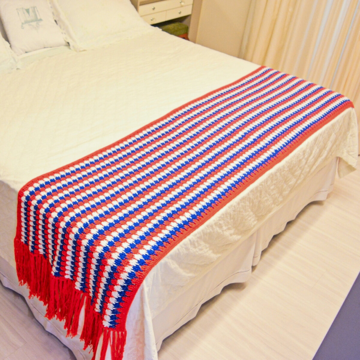Я заметила, что бразильские рукодельницы очень любят вот такие узкие пледы-дорожки. Наши рукодельницы обычно плюются и не считают это пледом. Мол, несолидно — что за «поддергушка», как сказала бы моя мама.