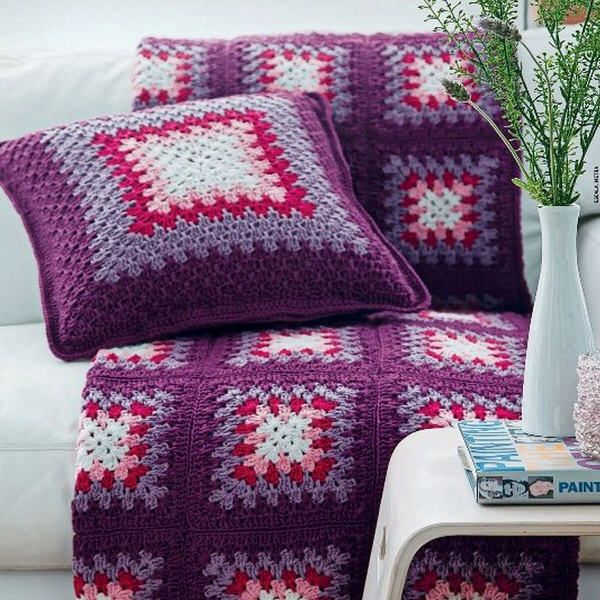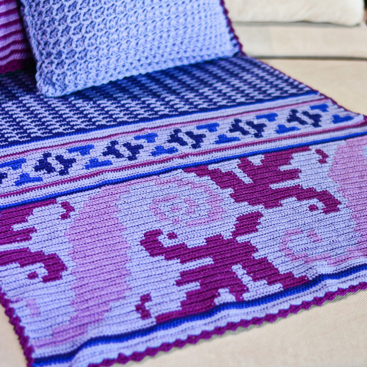 Потрясающий жаккардовый плед в фиолетово-сиреневой гамме. Настоящий вызов для продвинутых рукодельниц, хотя техника жаккарда крючком даже проще, чем спицами! А из узора тут только столбики с накидом, но… плед требует недюжинного терпения. Я уже не говорю о том, как муторно прятать хвостики. Хотя и здесь есть своя маленькая хитрость — их можно прятать сразу, в процессе вязания (поищите видео на ютюбе, как это делается).