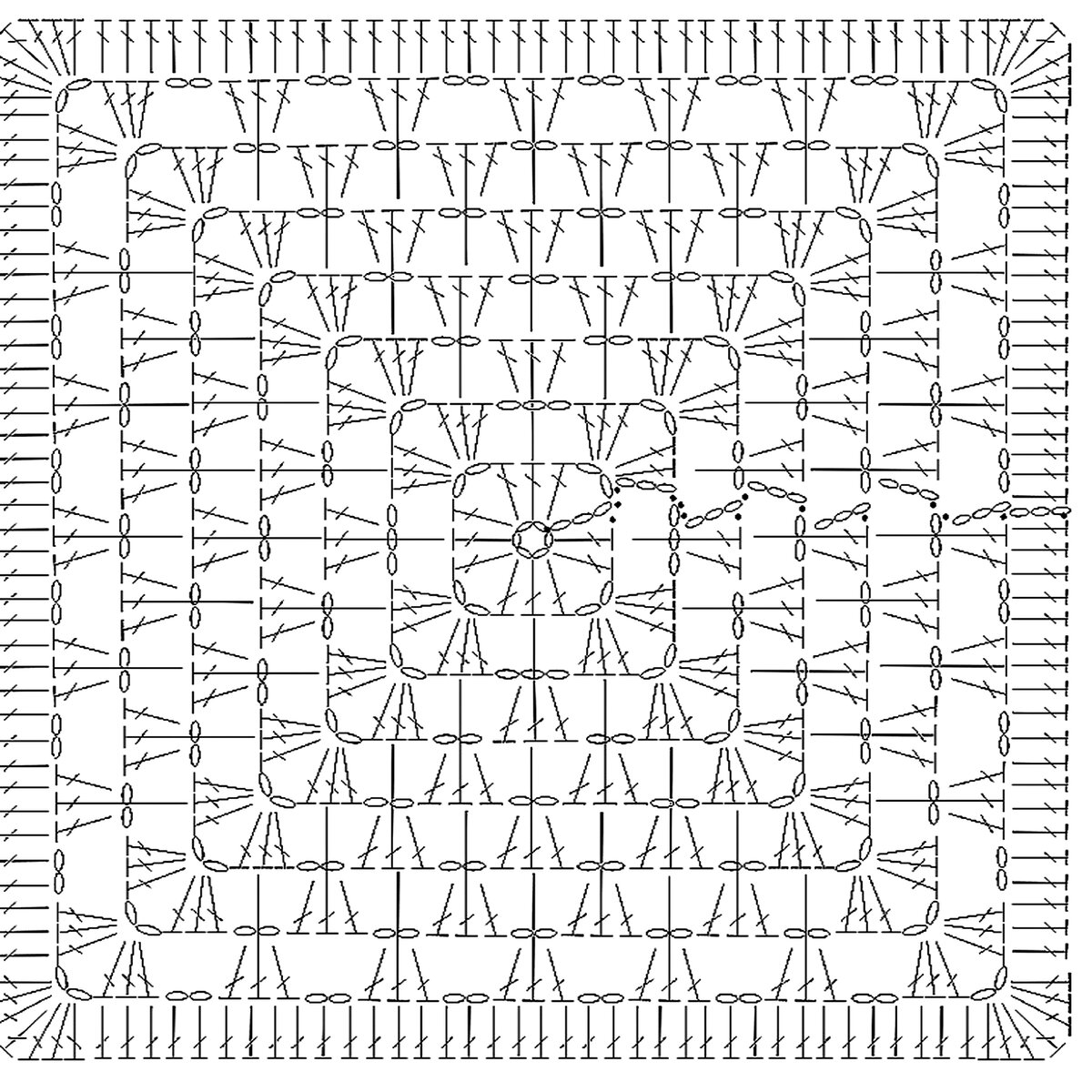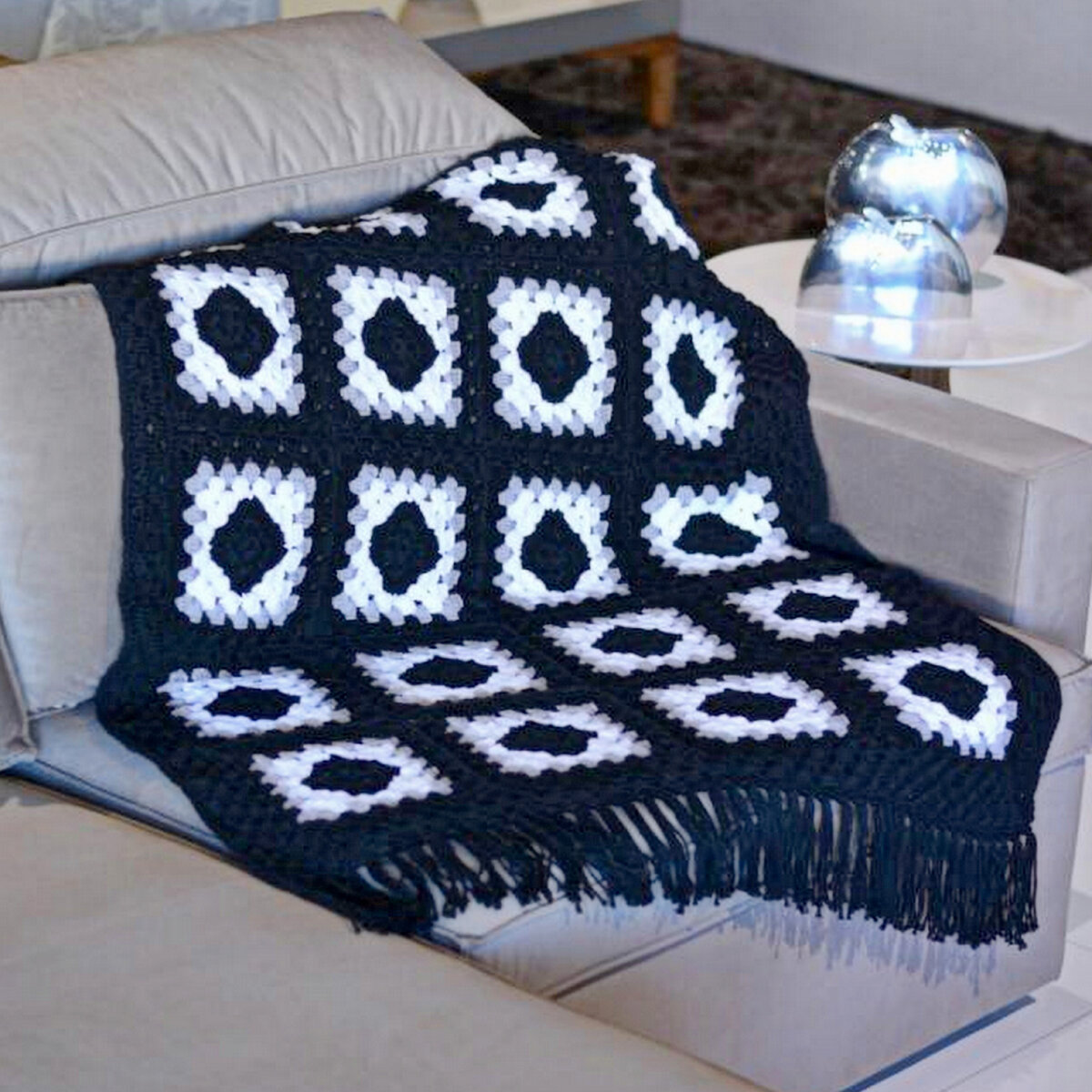 Кто сказал, что монохром не может быть ярким? По мне, так это очень даже яркое сочетание — сразу обратишь внимание! Классический бабушкин квадрат в классической чёрно-бело-серой гамме.