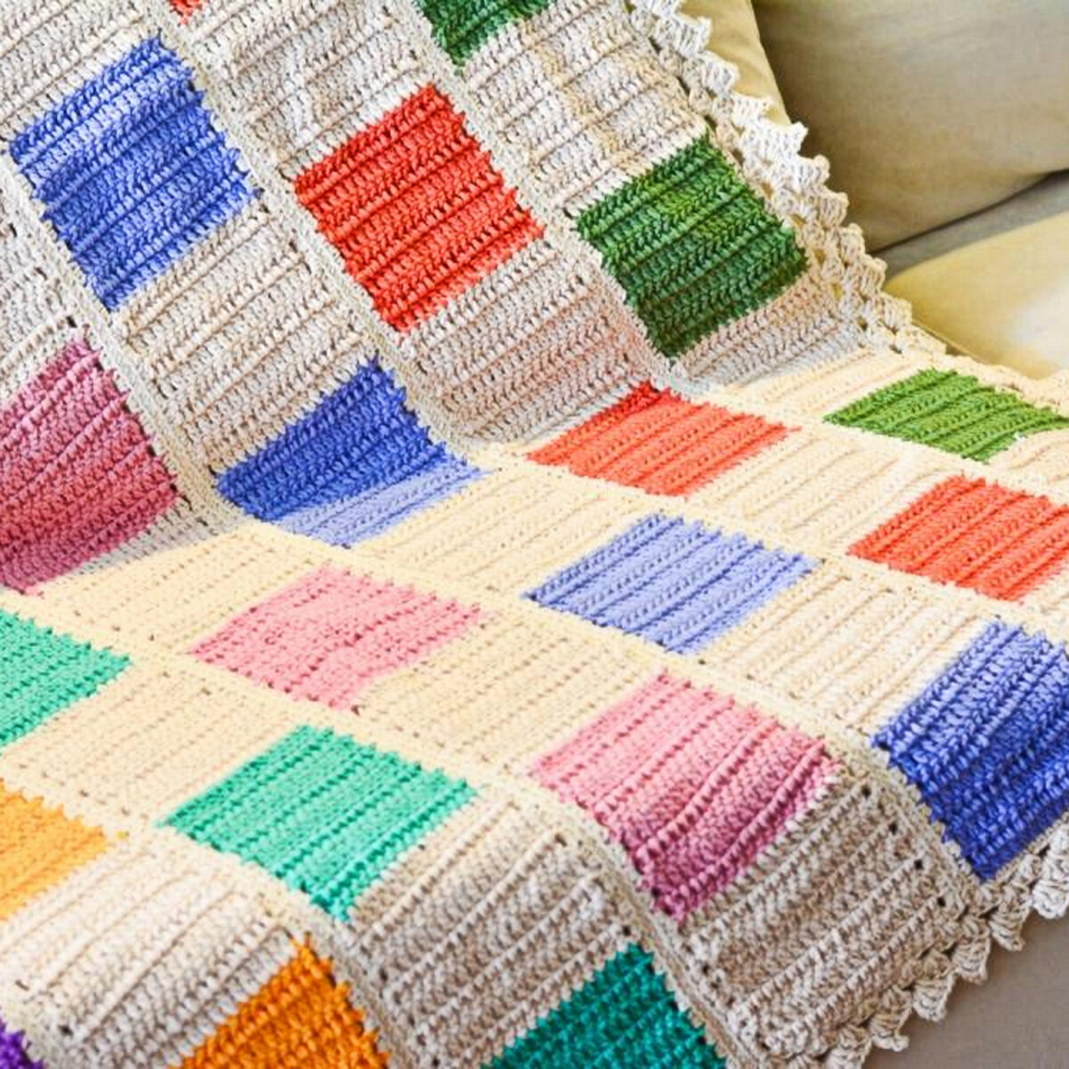Умеете вязать крючком только простенькие столбики без накида и с накидом? Не беда! И для таких азов найдётся достойная вещь. Цветная шахматка на натурально-белом фоне придётся по душе не только начинающим вязальщицам. Из узоров тут только столбики с накидом (ну ещё отделка по краю, которая здесь совсем необязательна).