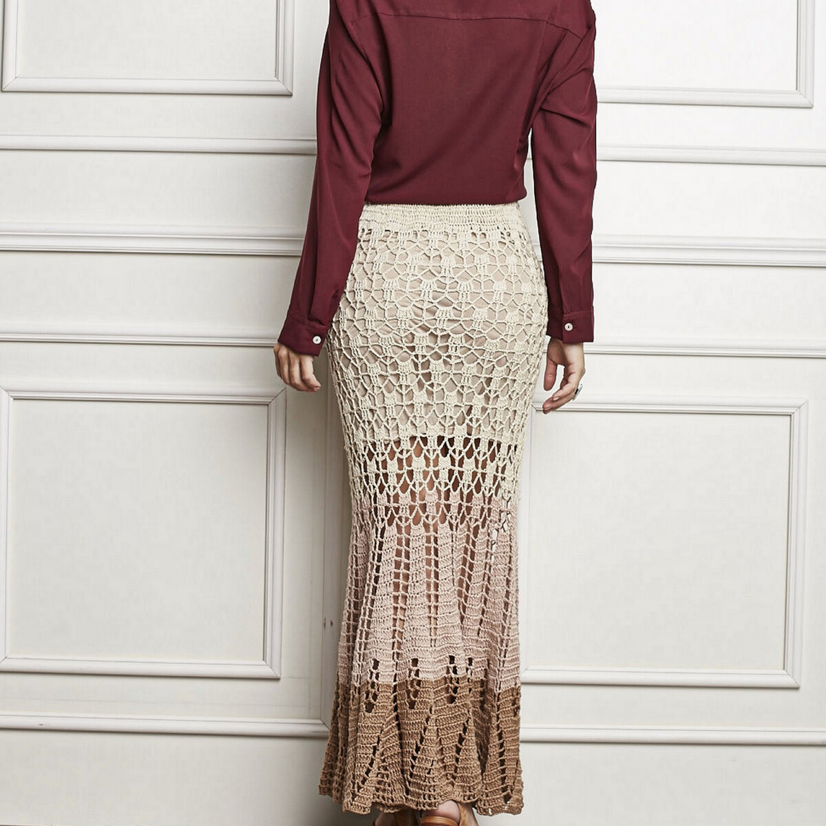 Трёхцветная юбка-колокол — облегающий верх и расклешенный низ. Крупный ажурный узор, плавно переходящий в более плотные клинья. Хотя, на мой взгляд, лучше было бы вязать наоборот — плотный верх (тогда можно и без подкладки обойтись) и воздушный низ.