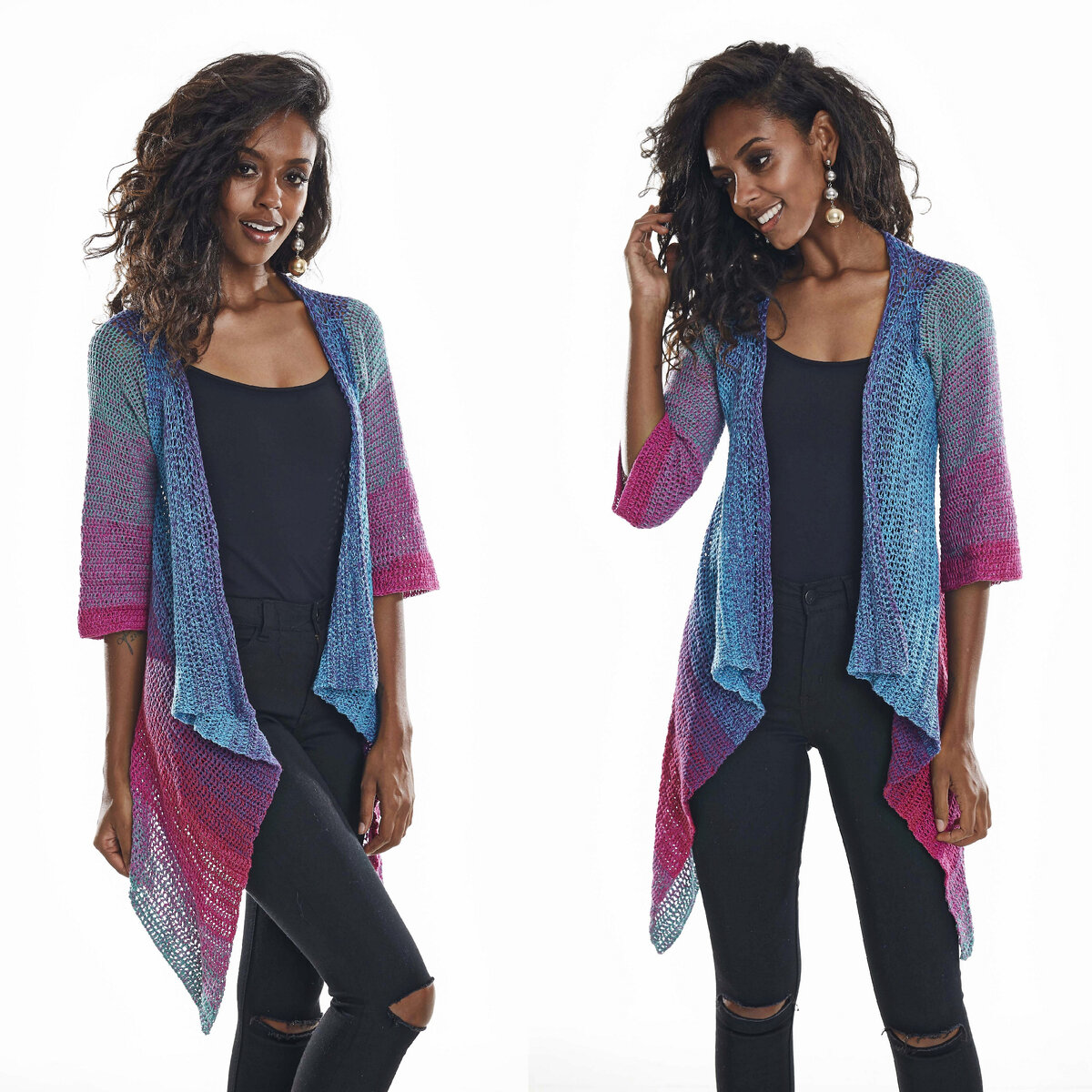 Яркий кардиган, связанный обычными столбиками с накидом, но как смотрится! Во многом благодаря интересной секционной пряже, конечно! Но и крой тут достаточно оригинальный — кажется, что он имеет асимметрию, но это только видимость. Очень простая выкройка из квадрата, с которой справится даже новичок.