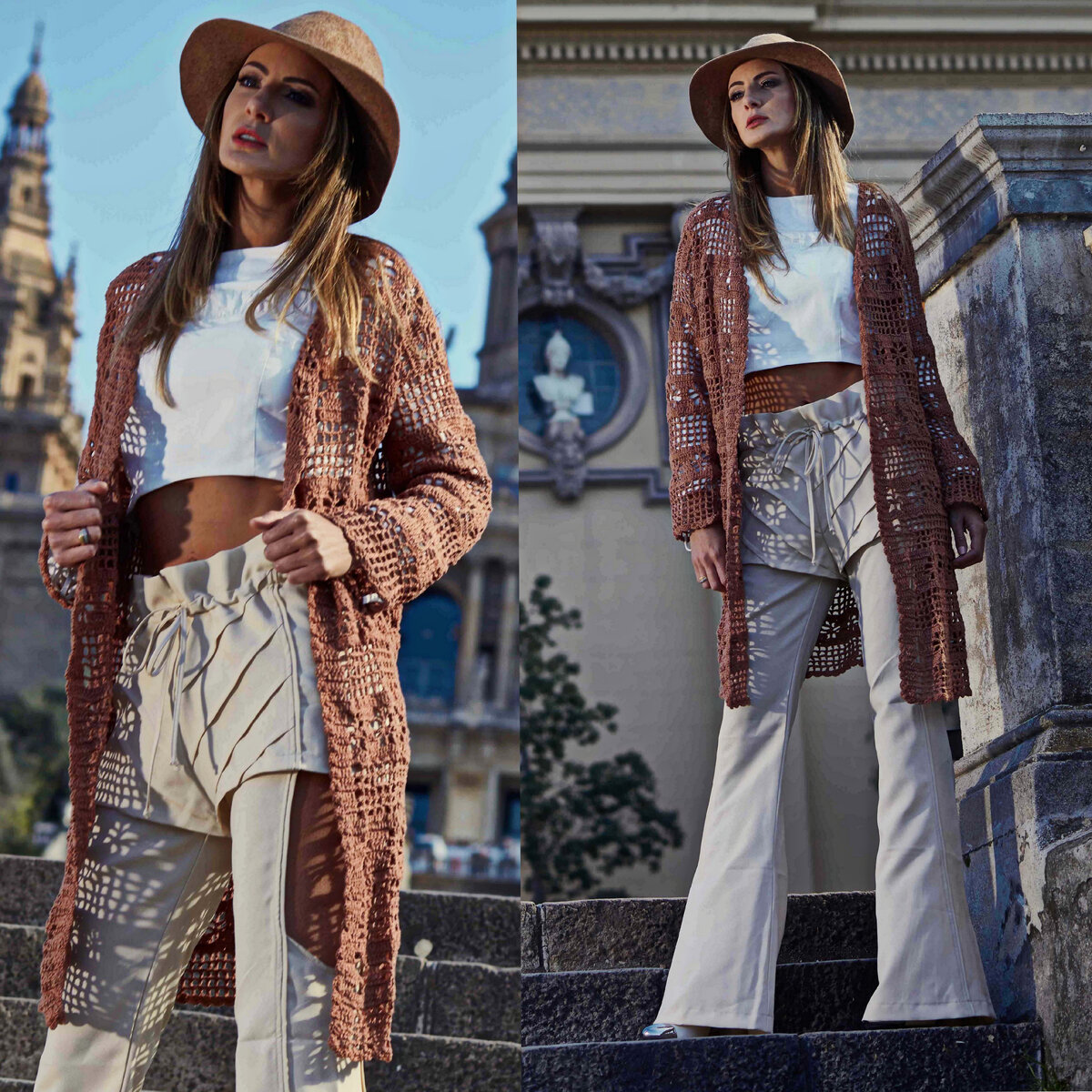 Нам потребуется 8 мотков — на размер 44-46 — коричневой пряжи: 100% хлопок; 50 гр — 167 м. Крючок № 2,5-3.