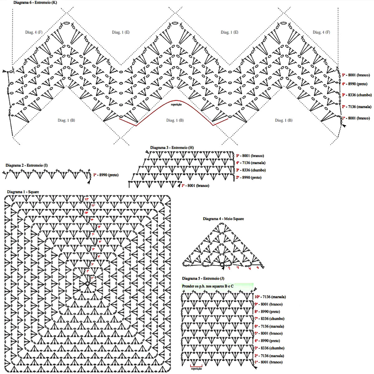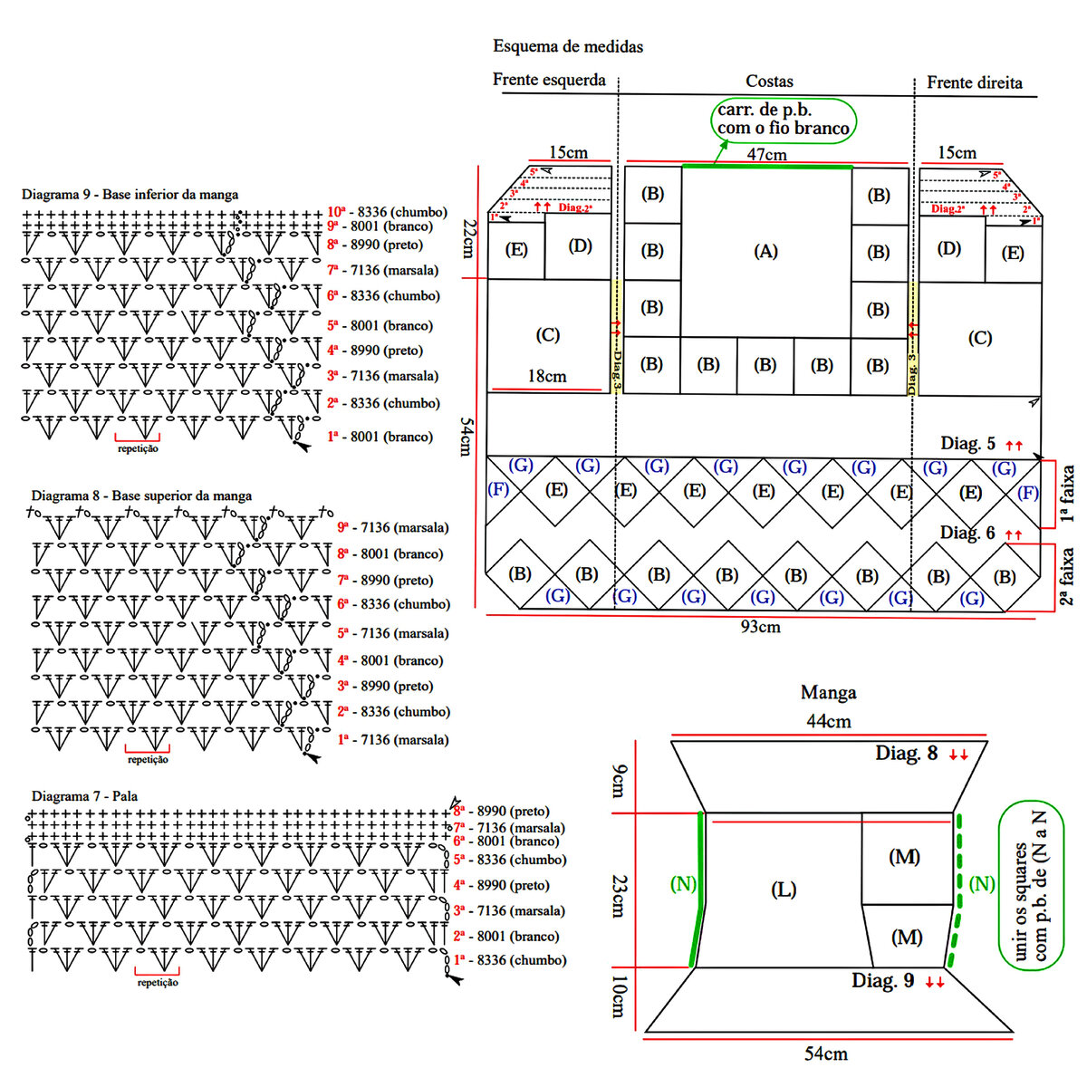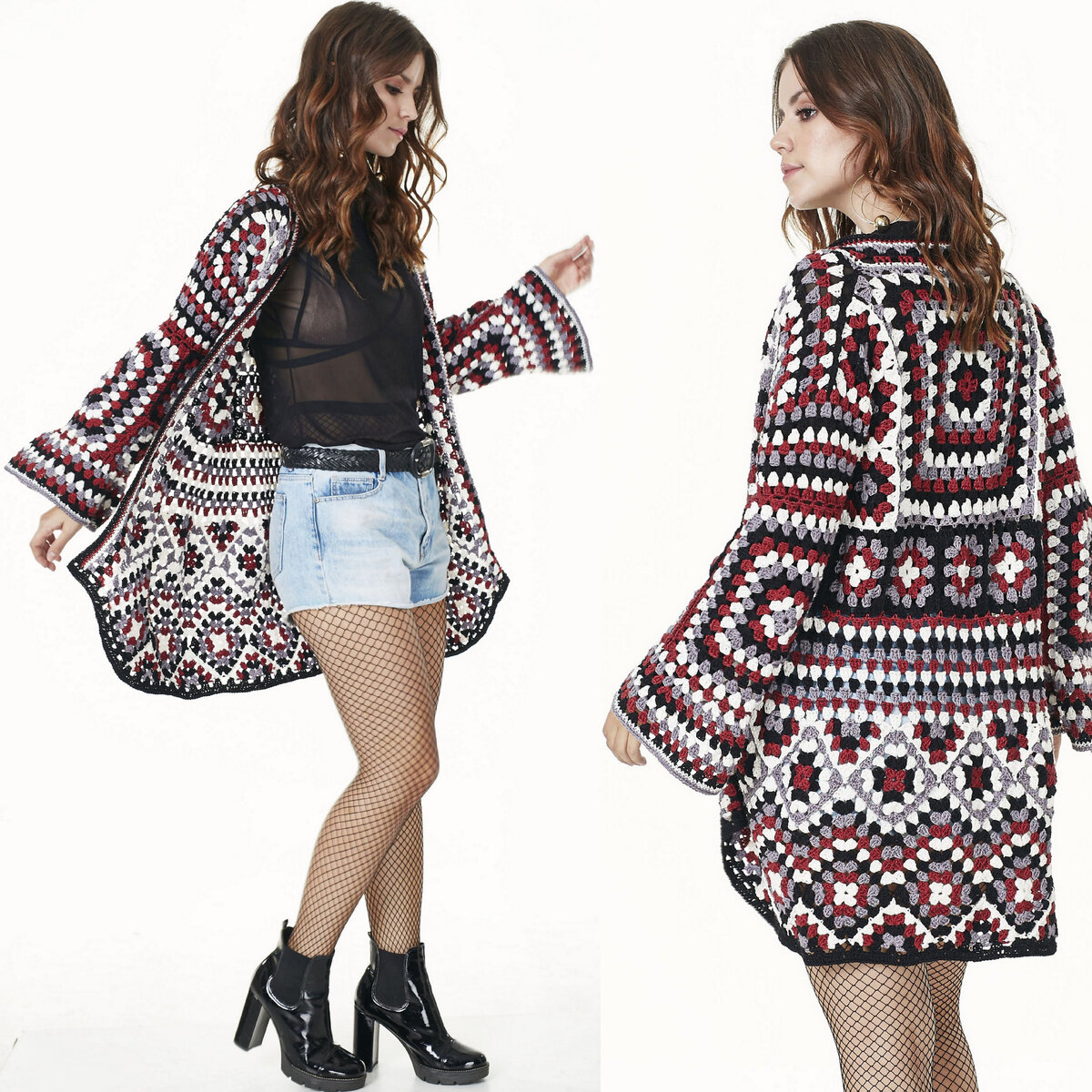 Какая же подборка крючком и без бабушкиного квадрата?! Стильный кардиган бело-серо-бордово-чёрной расцветки с простым прямым фасоном и оригинальными рукавами с расклешенными манжетами.
