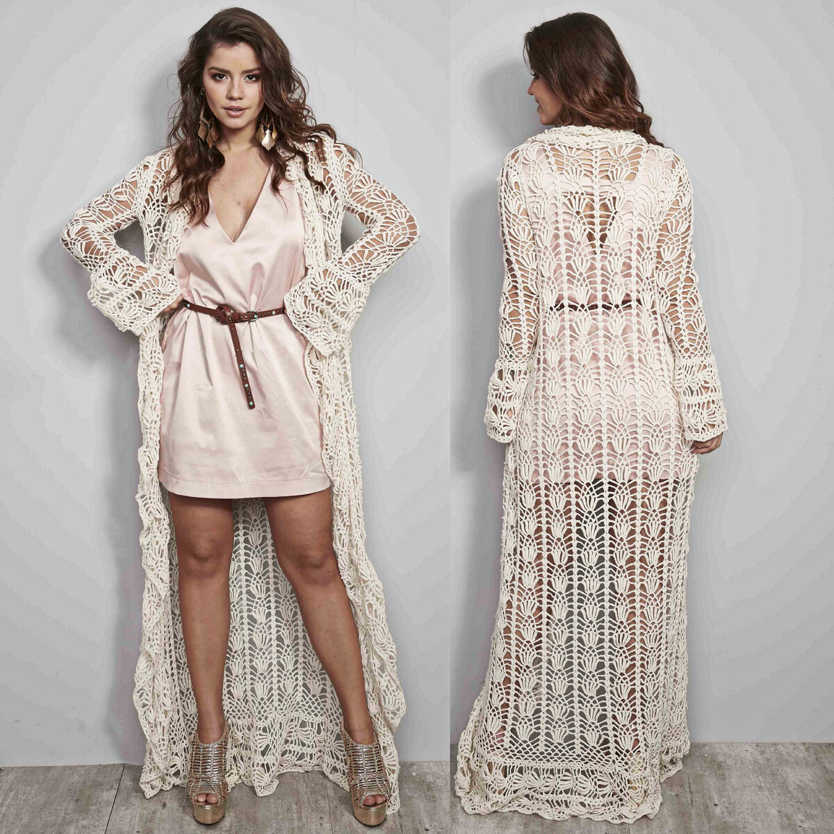 Роскошный кружевной кардиган натурально-белого цвета. Простой ажурный узор из ананасов и шикарная длина до самого пола. В таком кардигане нужно блистать!