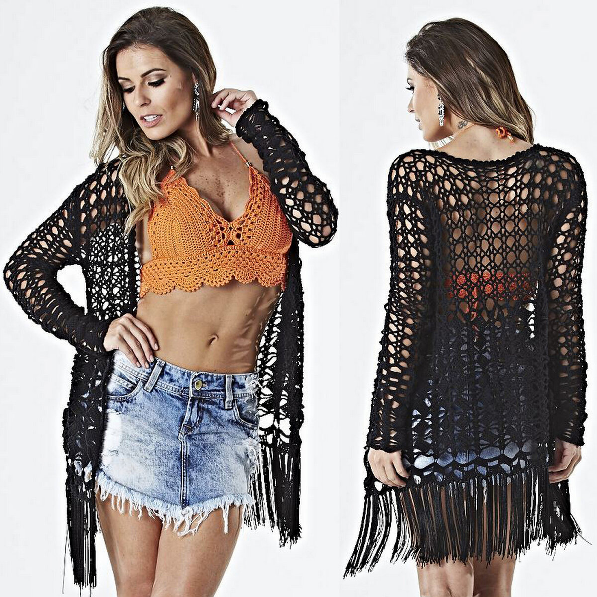 Не только маленькое чёрное платье должно быть у каждой модницы, но и чёрный кардиган тоже пригодится — универсальная эффектная сеточка, украшенная бахромой, которая наверняка займёт почётное место в вашем гардеробе.