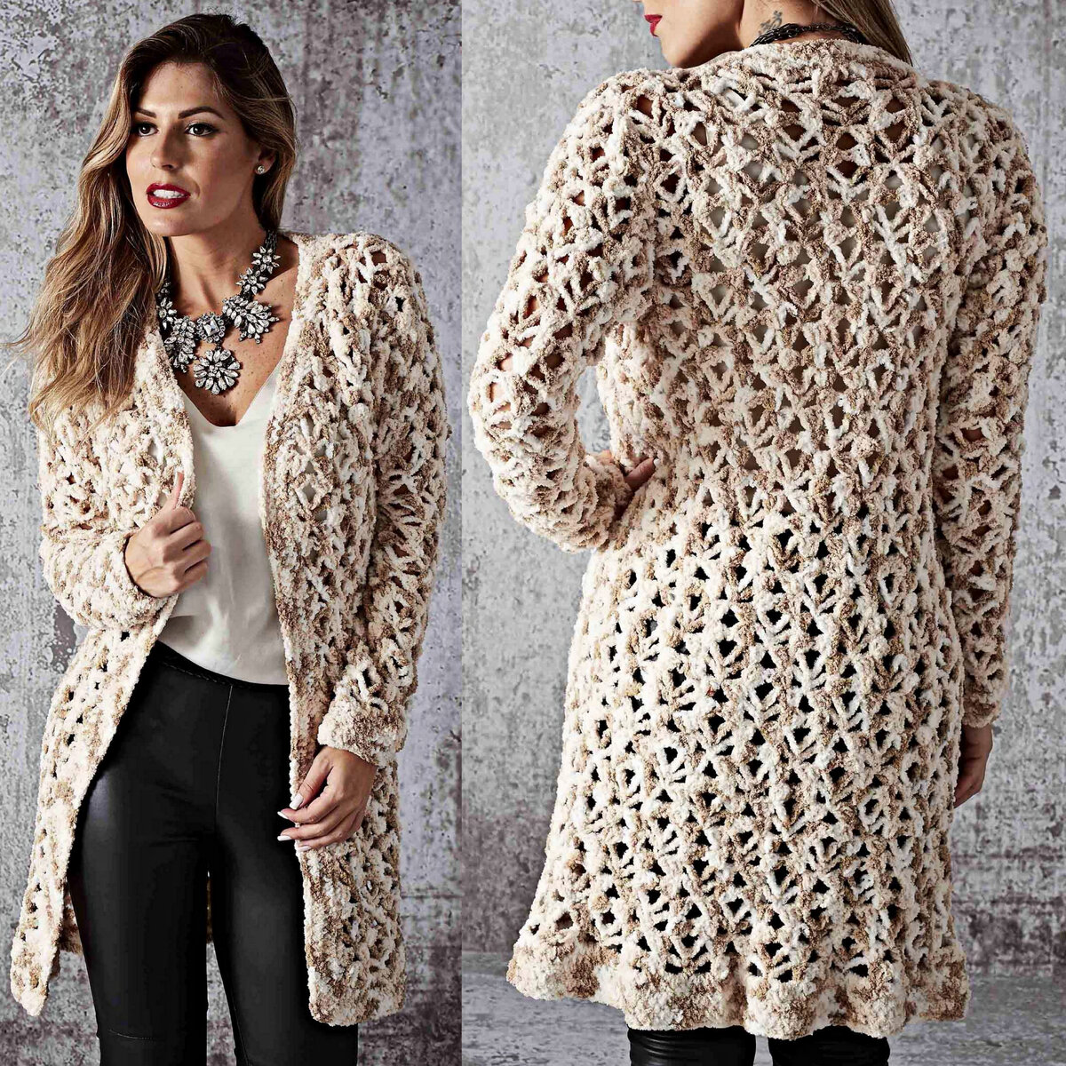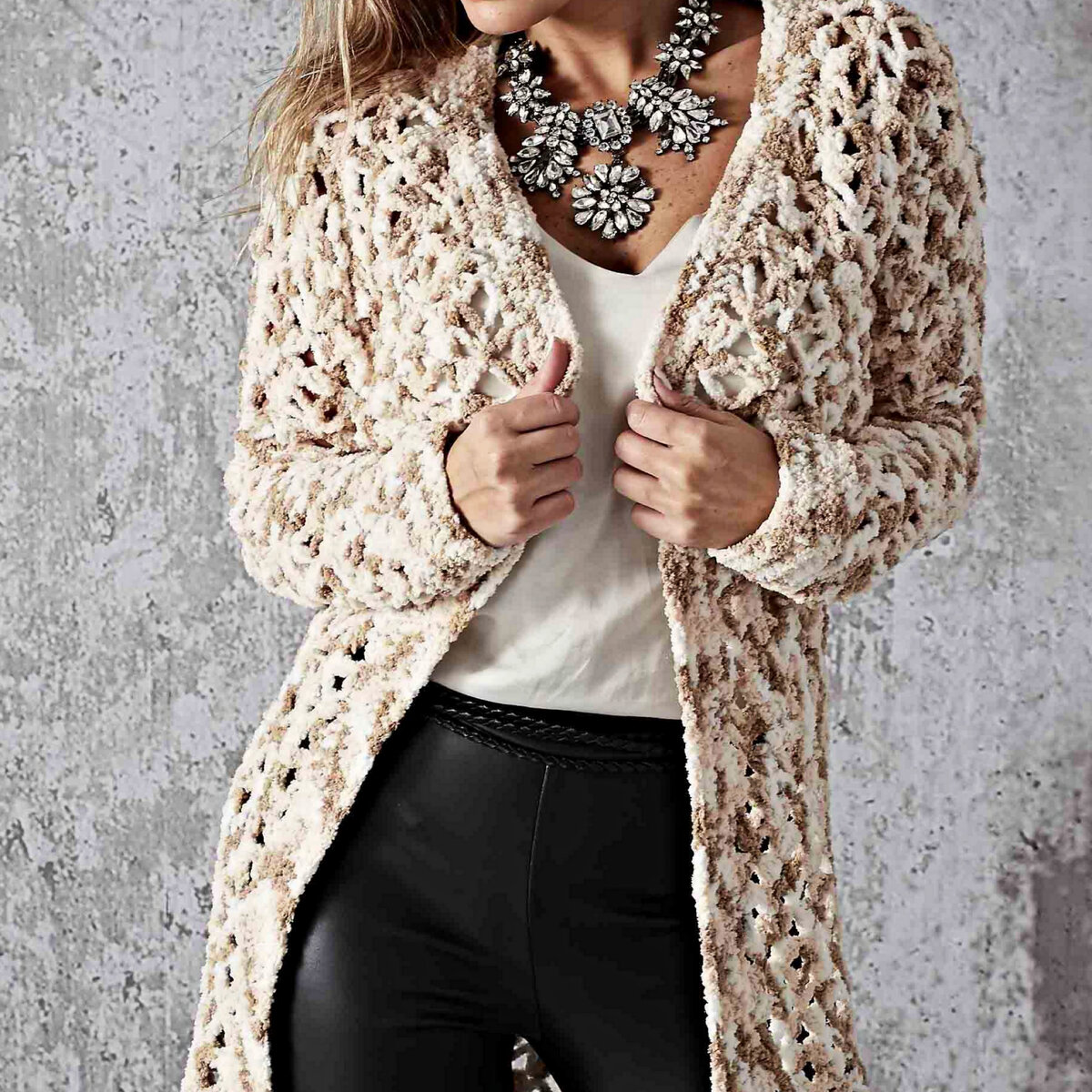 И последняя модель на сегодня — плюшевый кардиган из бежево-коричневой велюровой пряжи. Мягкая и уютная кофта, которую вы не захотите снимать. Отлично подойдёт в качестве домашнего варианта!