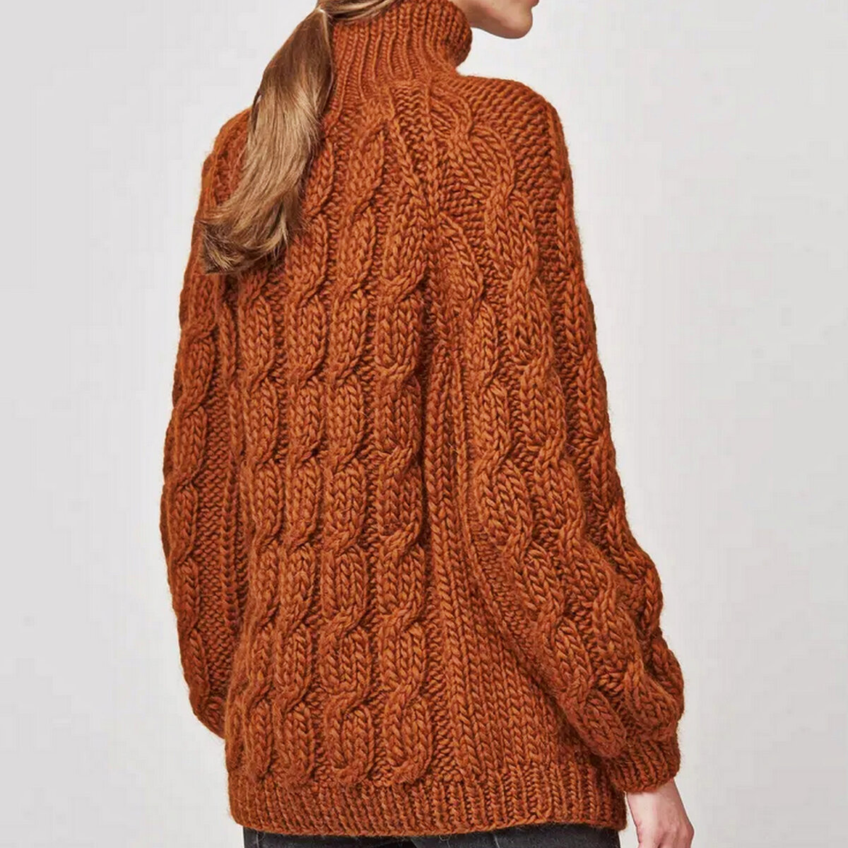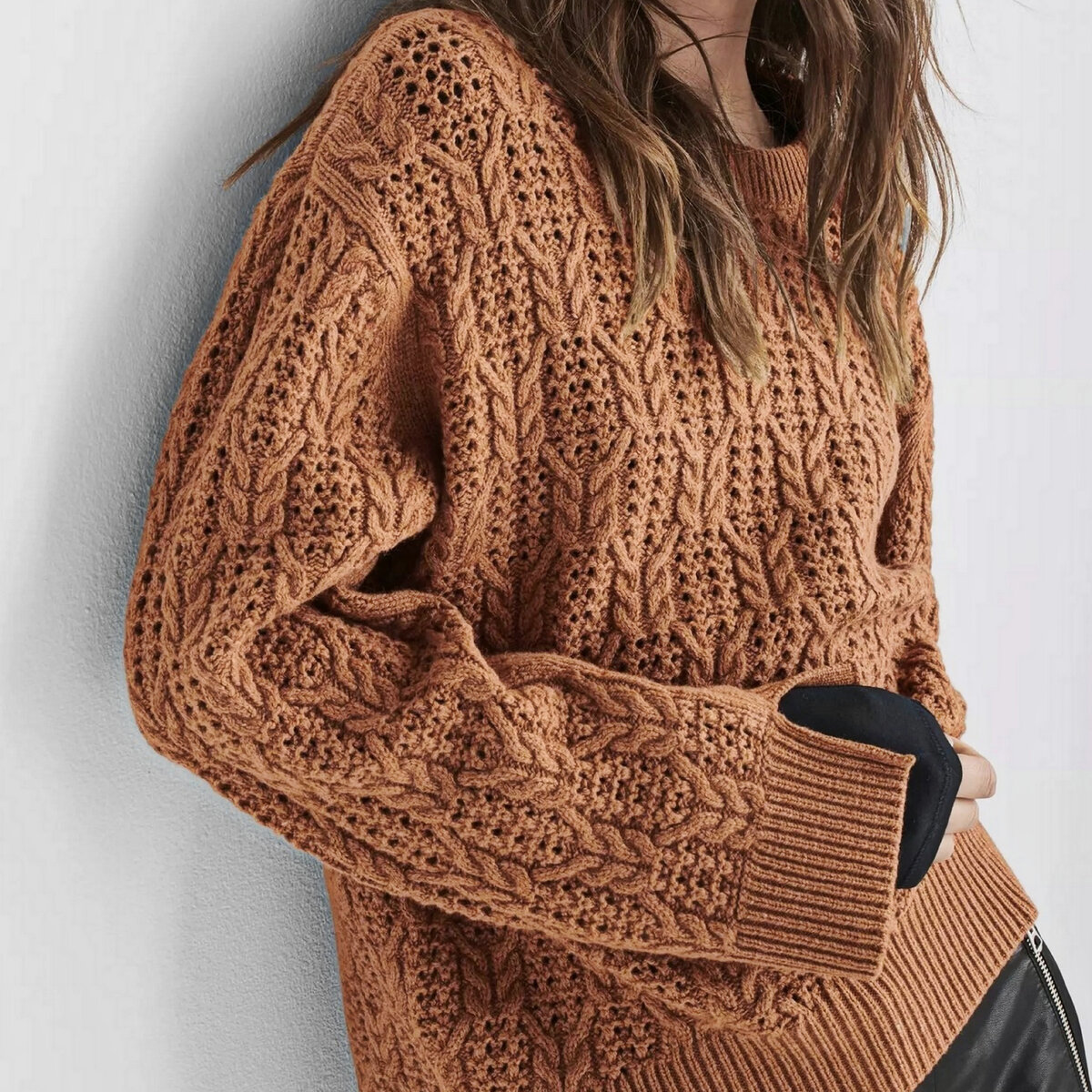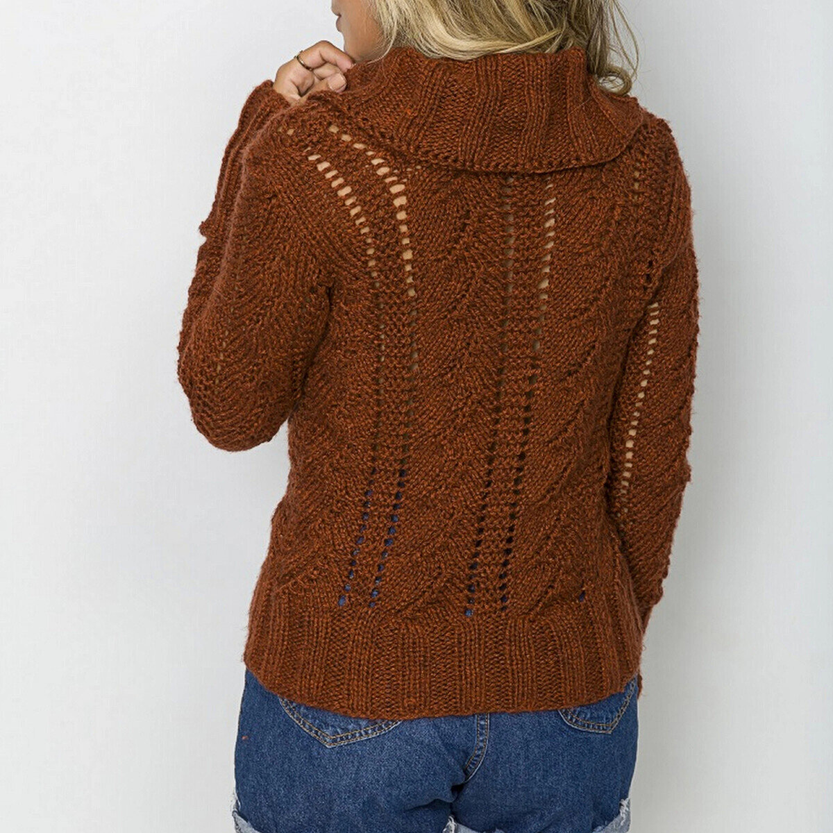 Симпатичный коричнево-рыжий свитер с красивым ажурным узором и широким воротником-хомутом.
