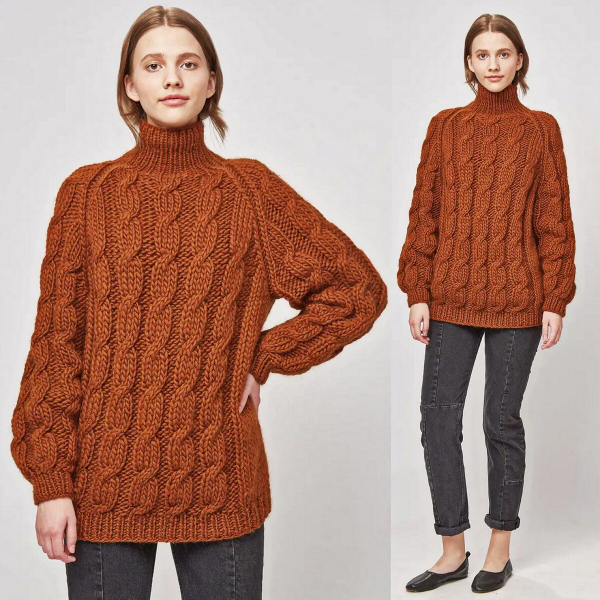 Ещё одна интересная модель от бренда Mirstores. Кирпично-рыжий свитер свободного кроя с облегающим воротником и широкими рукавами-реглан.