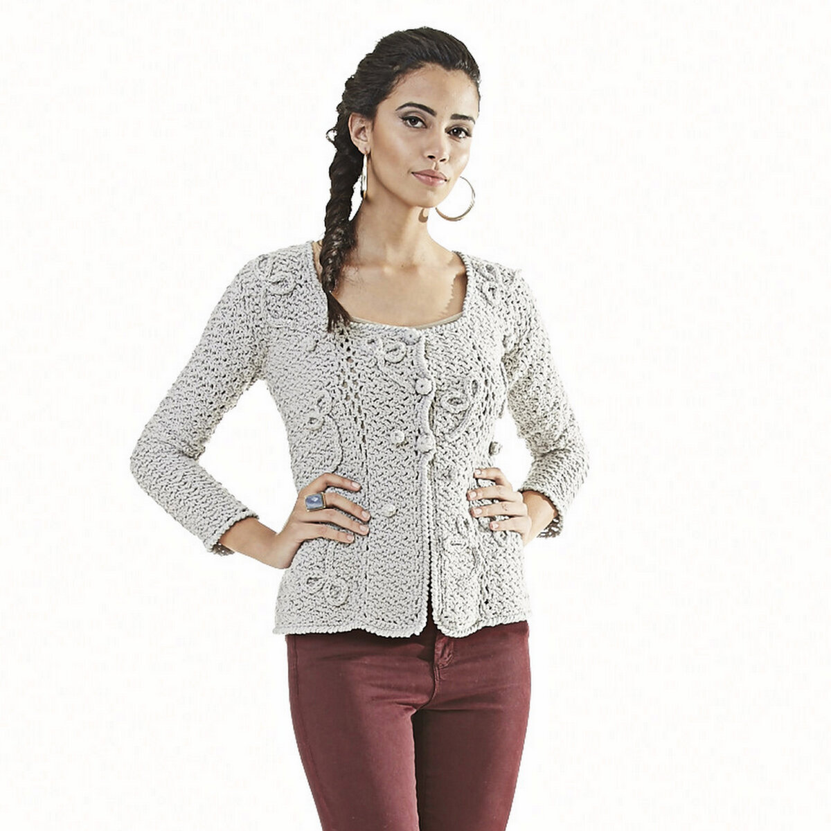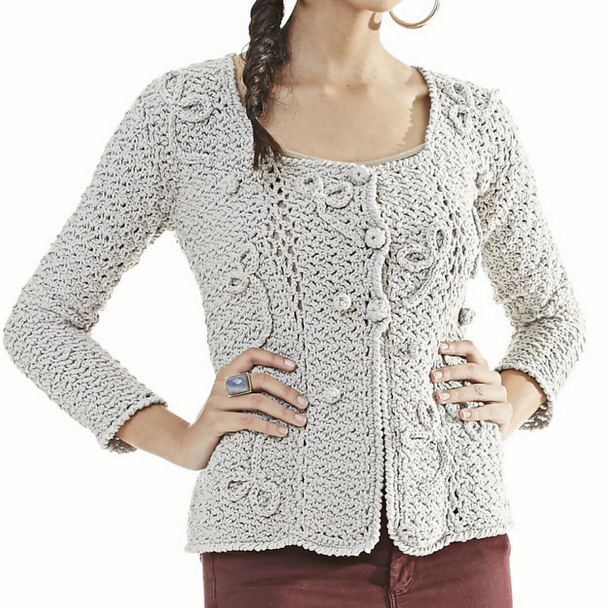 Классический светло-серый кардиган с рельефными завитками и шишечками. Узкий втачной рукав, широкая планка и глубокий трапециевидный вырез горловины.