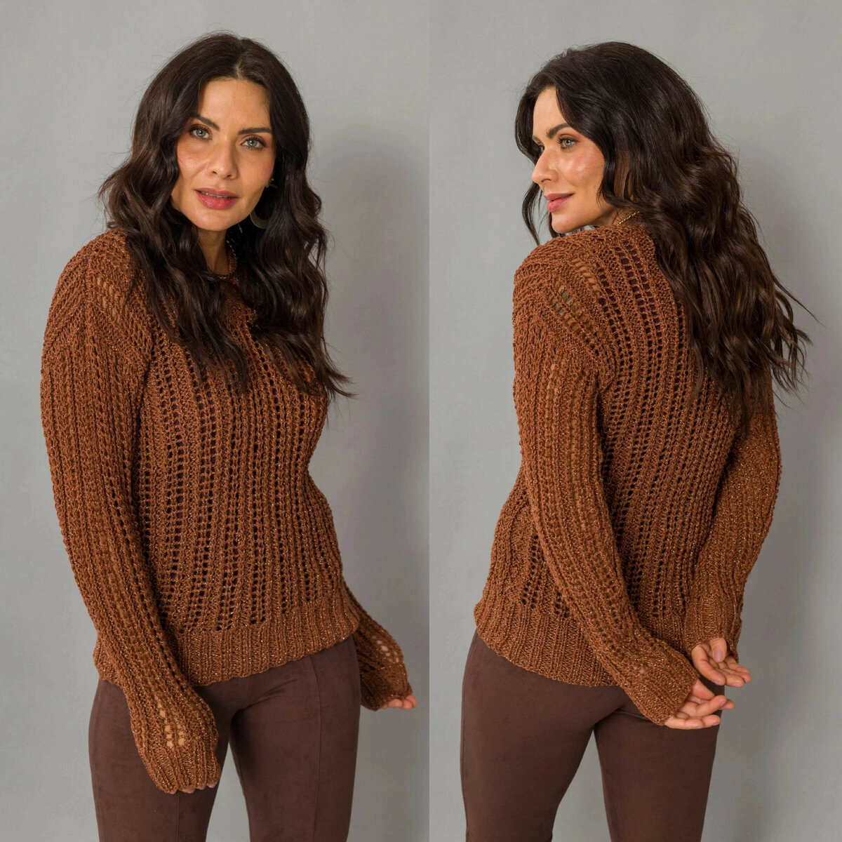 Сетчатый пуловер спицами цвета жженого сахара, ниточка с добавлением люрекса придаёт модели нежное сияние.
