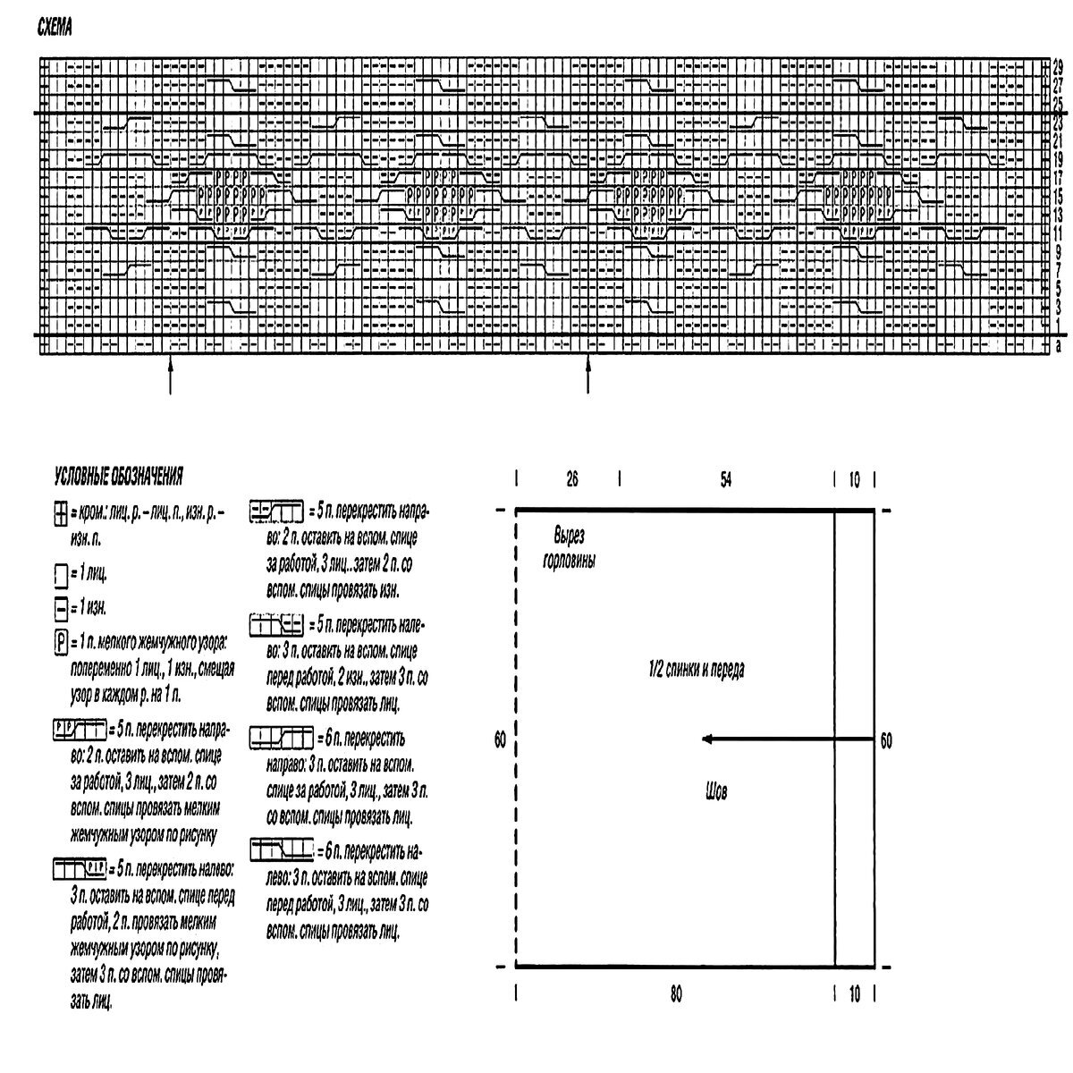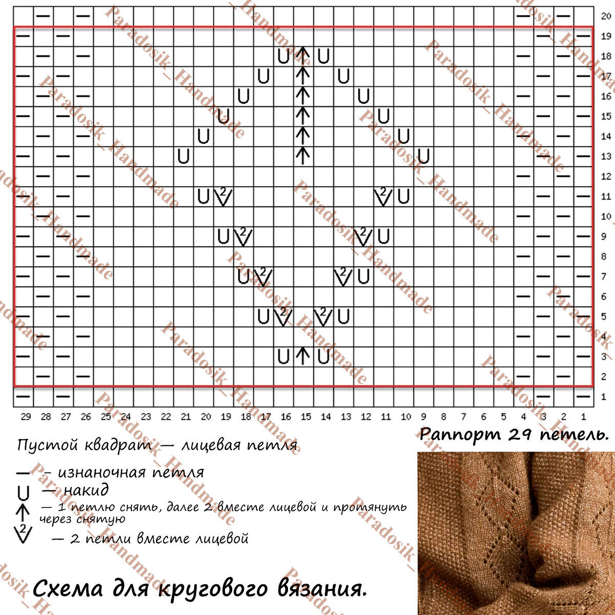 Раппорт узора 28 петель. Но в оригинале выше я вижу только одну изнаночную между косами, поэтому 2 петли от изнаночных на схеме можно смело убрать. На схеме указаны и лицевые, и изнаночные ряды.
