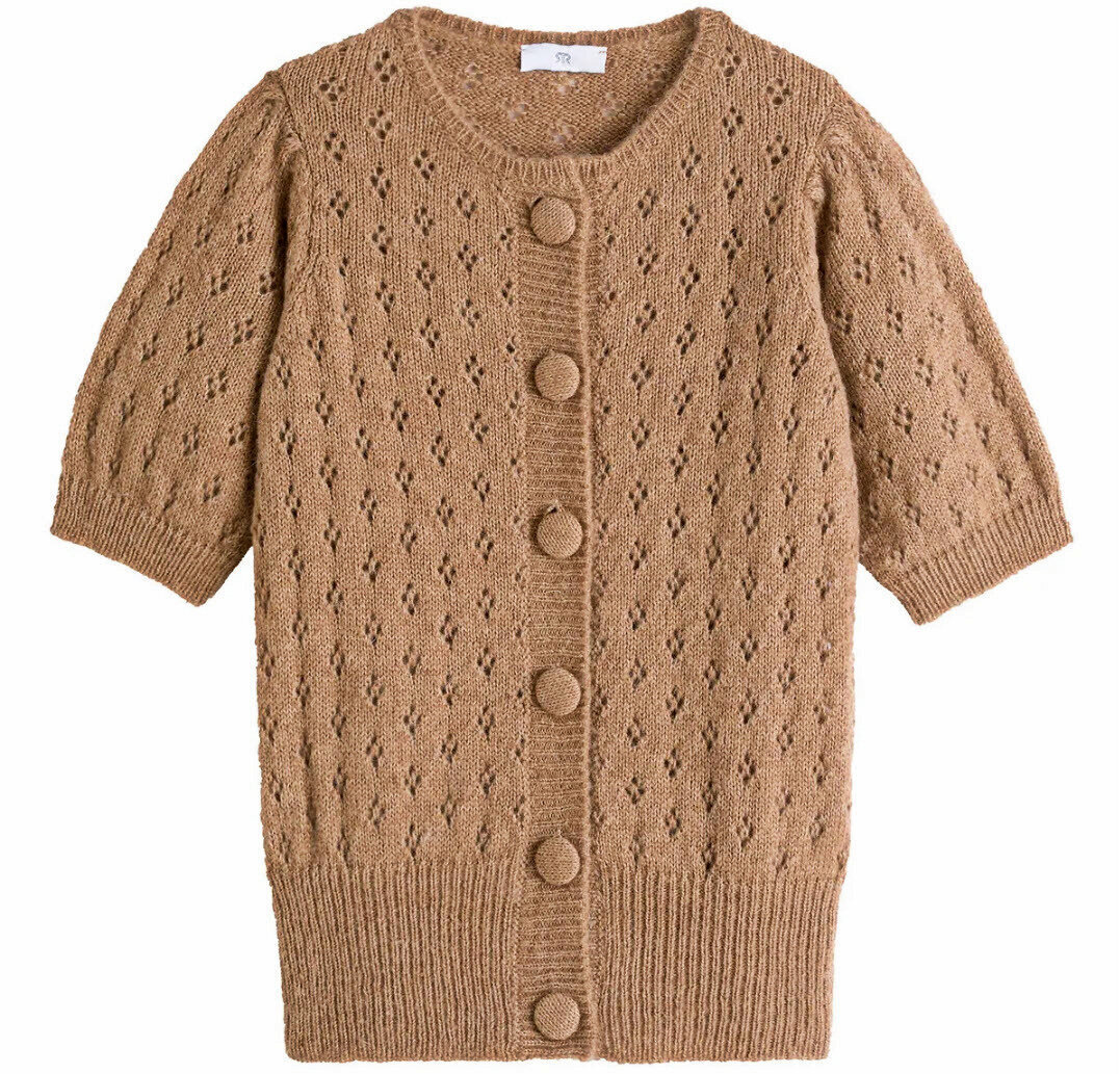 Укороченный кардиган спицами от Ла Редут цвета кофе с молоком. Фасон прямой, без приталивания, но за счёт широкой резинки по краю будет небольшое облегание. Короткие рукавчики выше локтя, на резинке 1х1, а также широкая резинка внизу. Убавление пройм под втачной рукав, с небольшой присборкой. Поперечная планка и крупные обвязанные пуговицы. Пуговицы мне здесь особенно нравятся.