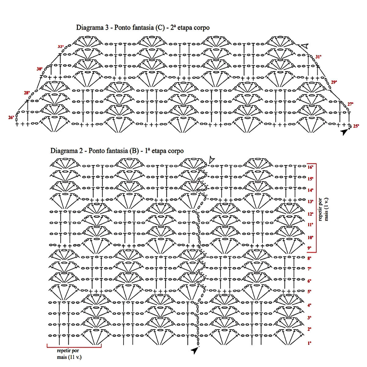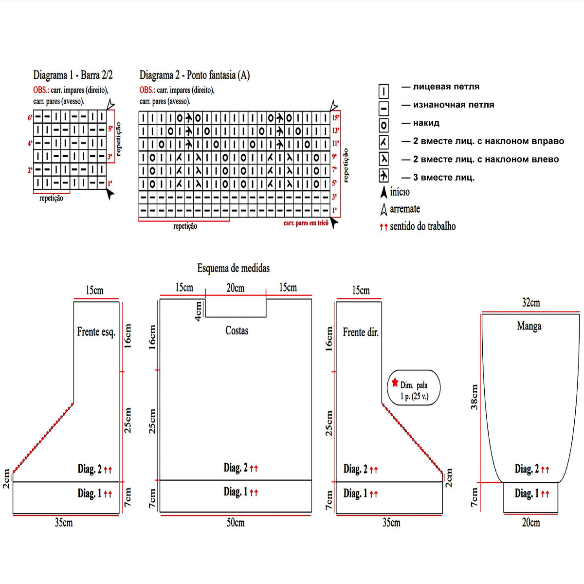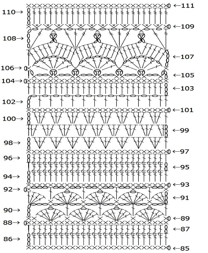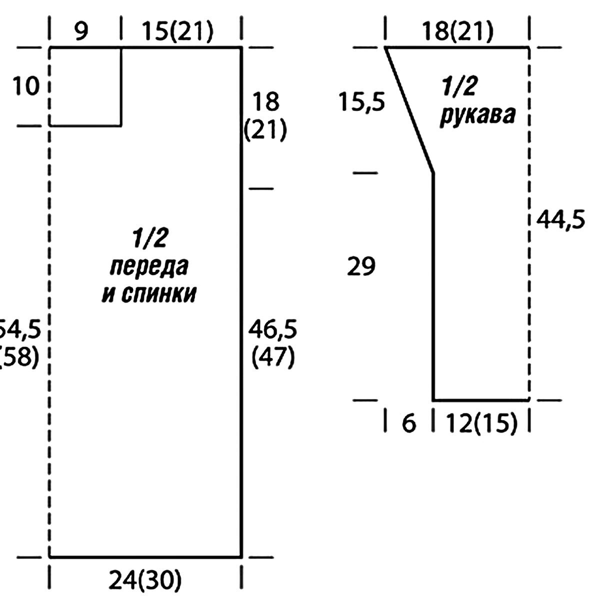 Спинка вяжется лицевой гладью. Обратите внимание, что схема для кругового вязания — указаны и лицевые (нечётные) и изнаночные (чётные) ряды —, но для поворотных рядов добавлены уточнения касательно изнаночных (чётных) рядов).