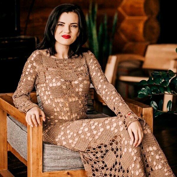 Элегантное филейное платье крючком цвета кофе с молоком от потрясающей мастерицы Даны Романовой.