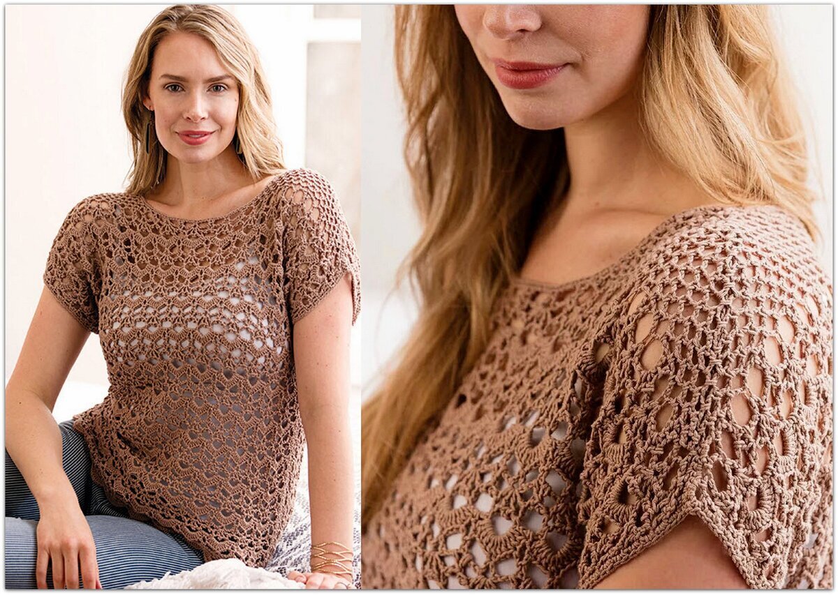 Роскошный кофейный топ спицами с рельефным узором из объёмных жгутов и ажурных ромбов. Небольшой рукавчик, круглый вырез горловины и отделка ажурной резинкой.