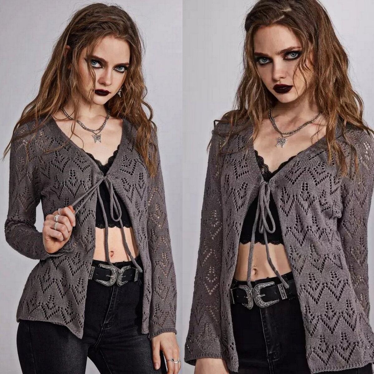 Кофейный кардиган спицами от Shein с кокетливыми завязочками вверху. Простая ажурная модель до середины бедра, глубокий V-образный вырез, фиксирующийся тонкими завязочками, втачной рукав. Тонкая отделка по краю и на манжетах — резинка 1 х 1. Планка — резинкой из вытянутых лицевых петель.