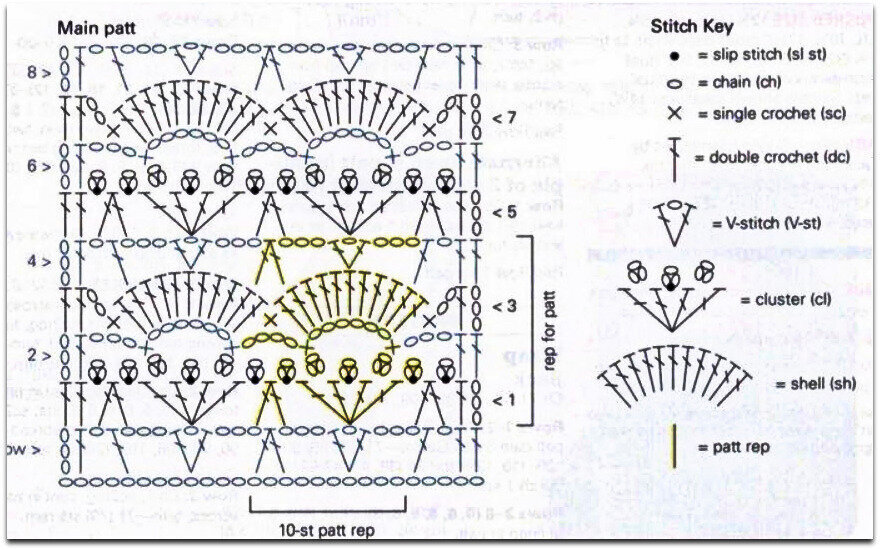 Раппорт основного ажурного узора всего 10 петель (+1 петля для симметрии узора) и 16 рядов в высоту. Схема для вязания поворотными рядами, указаны только лицевые ряды: