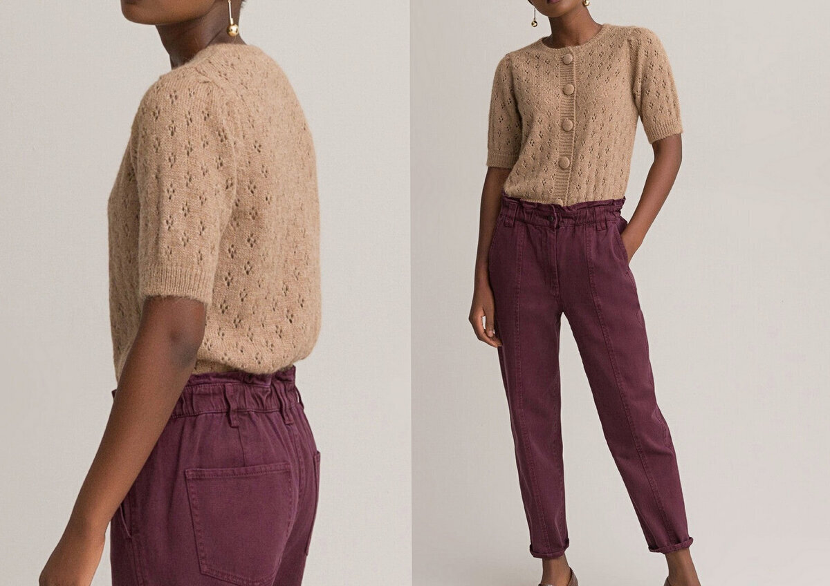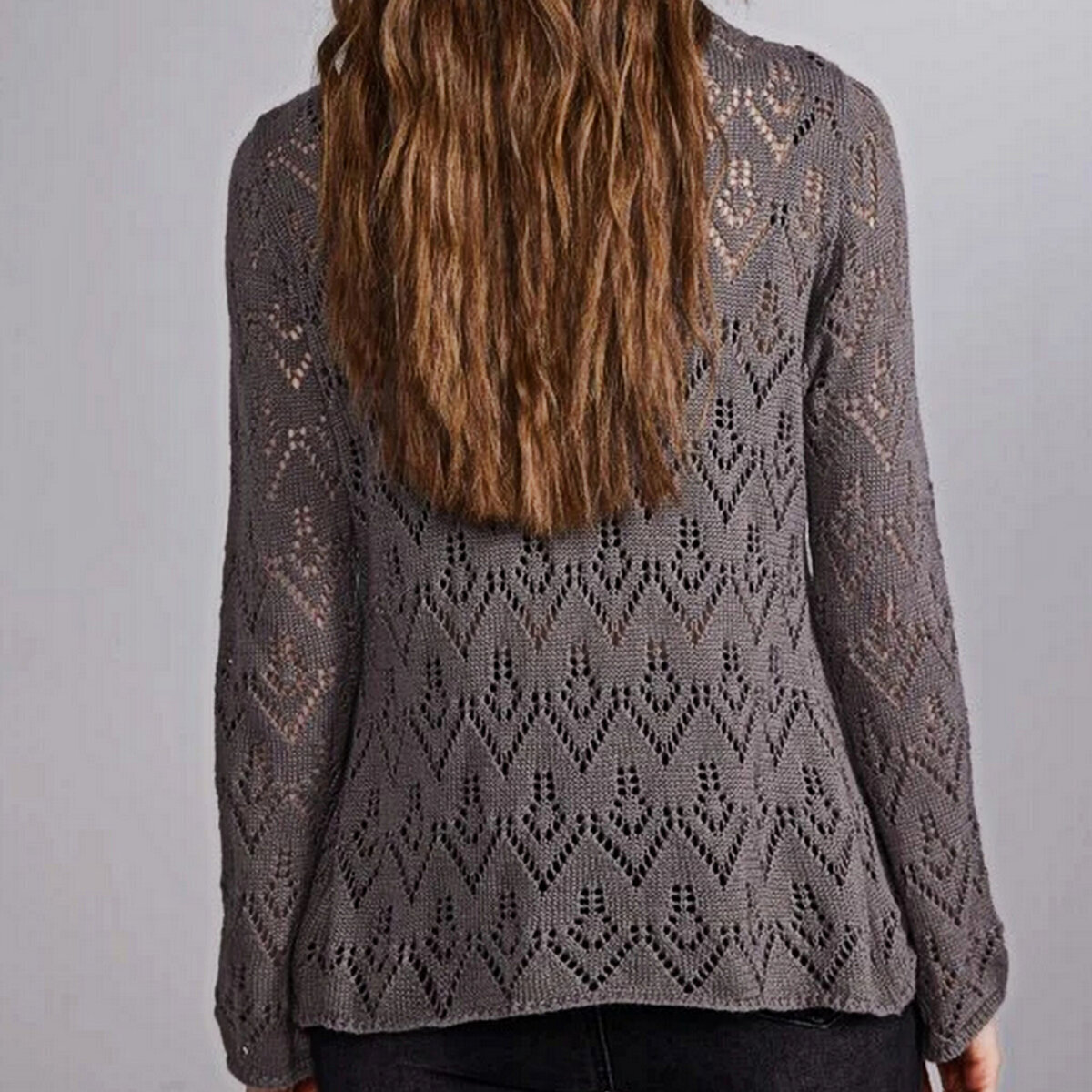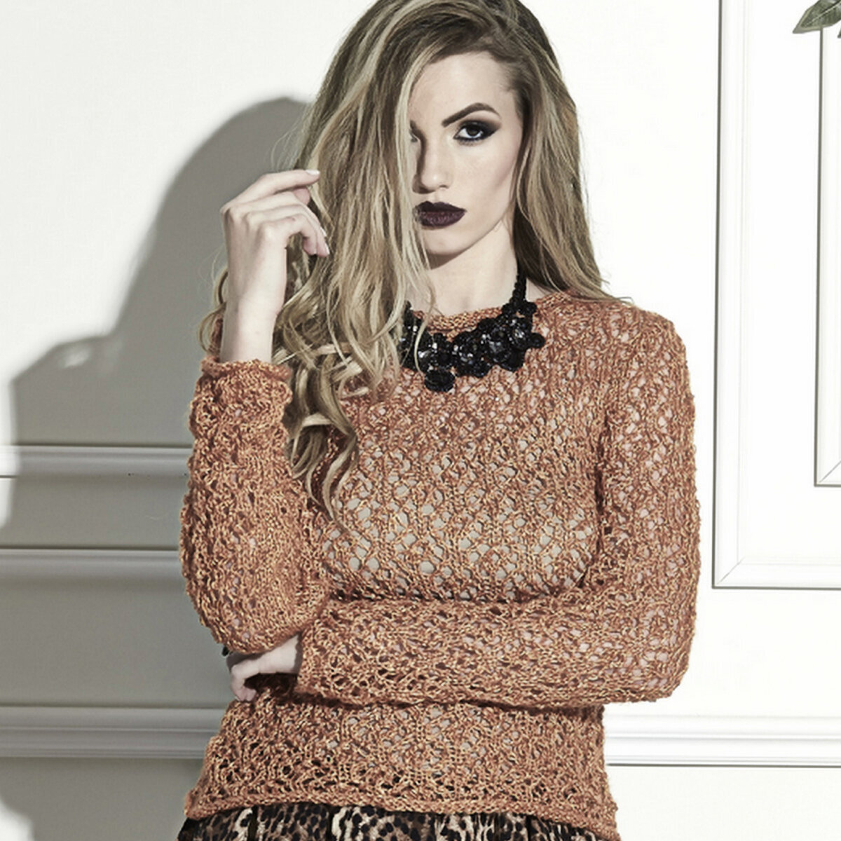 Этот невесомый джемпер, связанный крючком, деликатно поблёскивает при каждом движении. Облегающий силуэт, узкий длинный рукав и небольшой круглый вырез горловины, отделанный узором «пико».