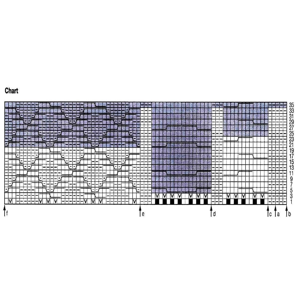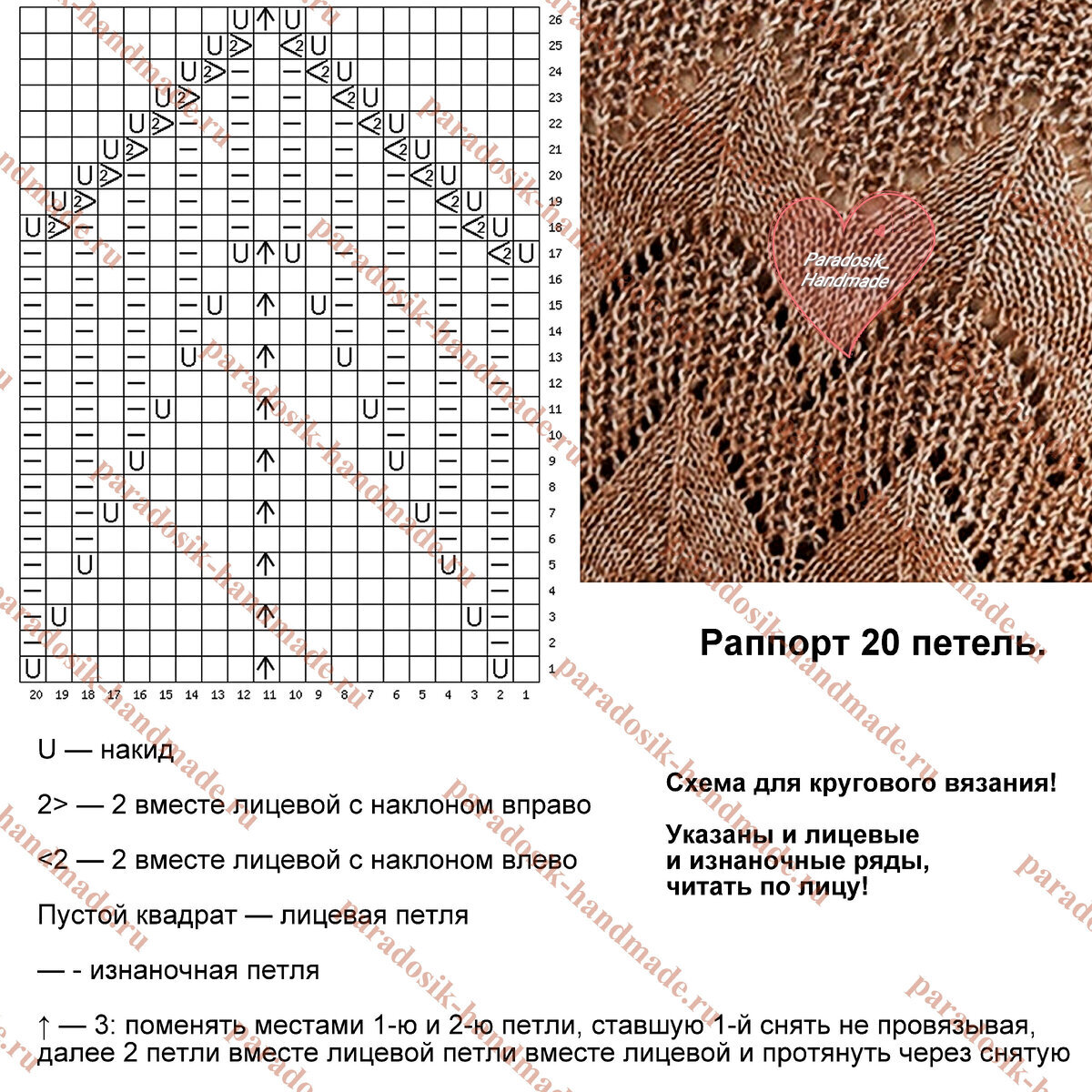 Обратите внимание, что схема для кругового вязания — указаны и чётные и нечётные ряды. Для удобства вязания (чтобы не напутать с петлями), схема читается по лицу, поэтому если вы соберётесь вязать поворотными рядами — чётные ряды отзеркаливайте.