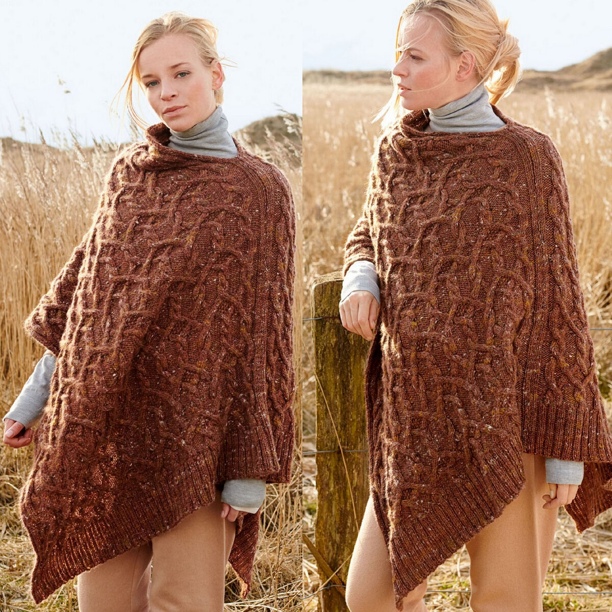 Красивое твидовое пончо с косами, которое согреет в любые морозы. Оригинальная асимметричная модель спицами.