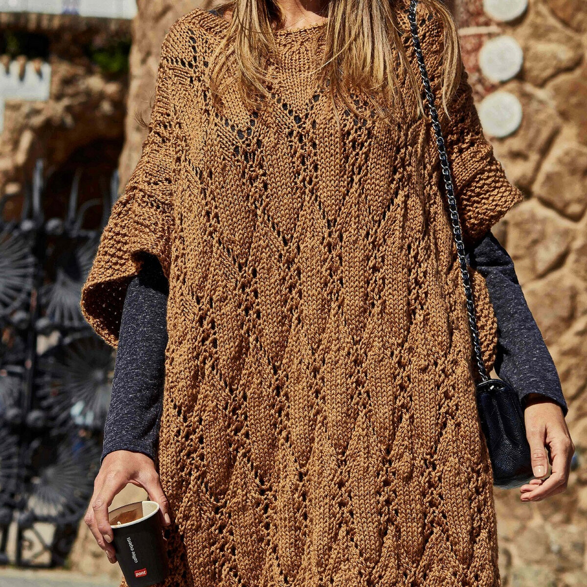 Стильная золотисто-коричневая туника оверсайз спицами. Такая туника вполне может сойти и за платье! Прямой крой, сильно спущенный широкий рукав и небольшой вырез лодочкой.
