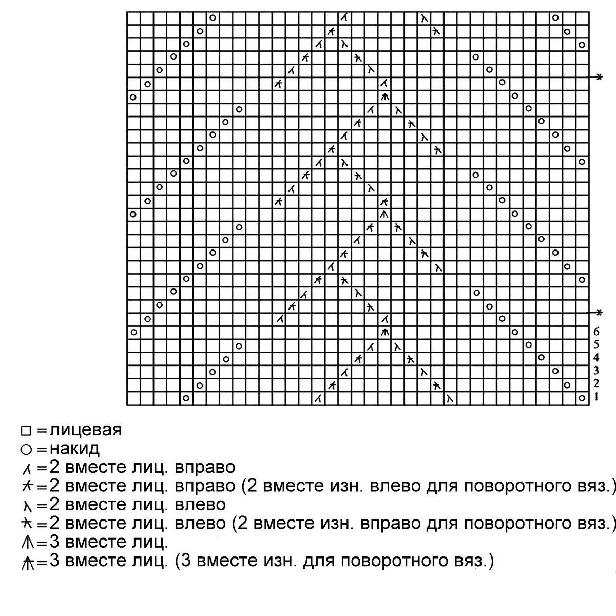 Друзья! Обратите внимание, что схему я начертила для кругового вязания. Сделала я это для всеобщего удобства и чтобы не путаться в обозначениях, так как узор вяжется и в лицевых и в изнаночных рядах. При вязании поворотными рядами просто отзеркаливайте текущие обозначения (где лицевая — вяжите изнаночной, где изнаночная — лицевой, и так далее).