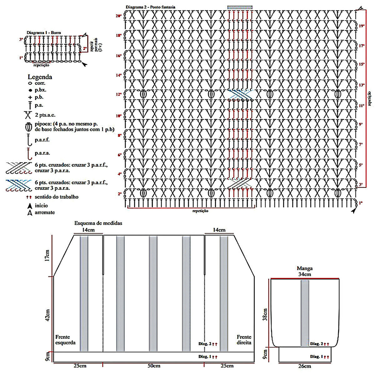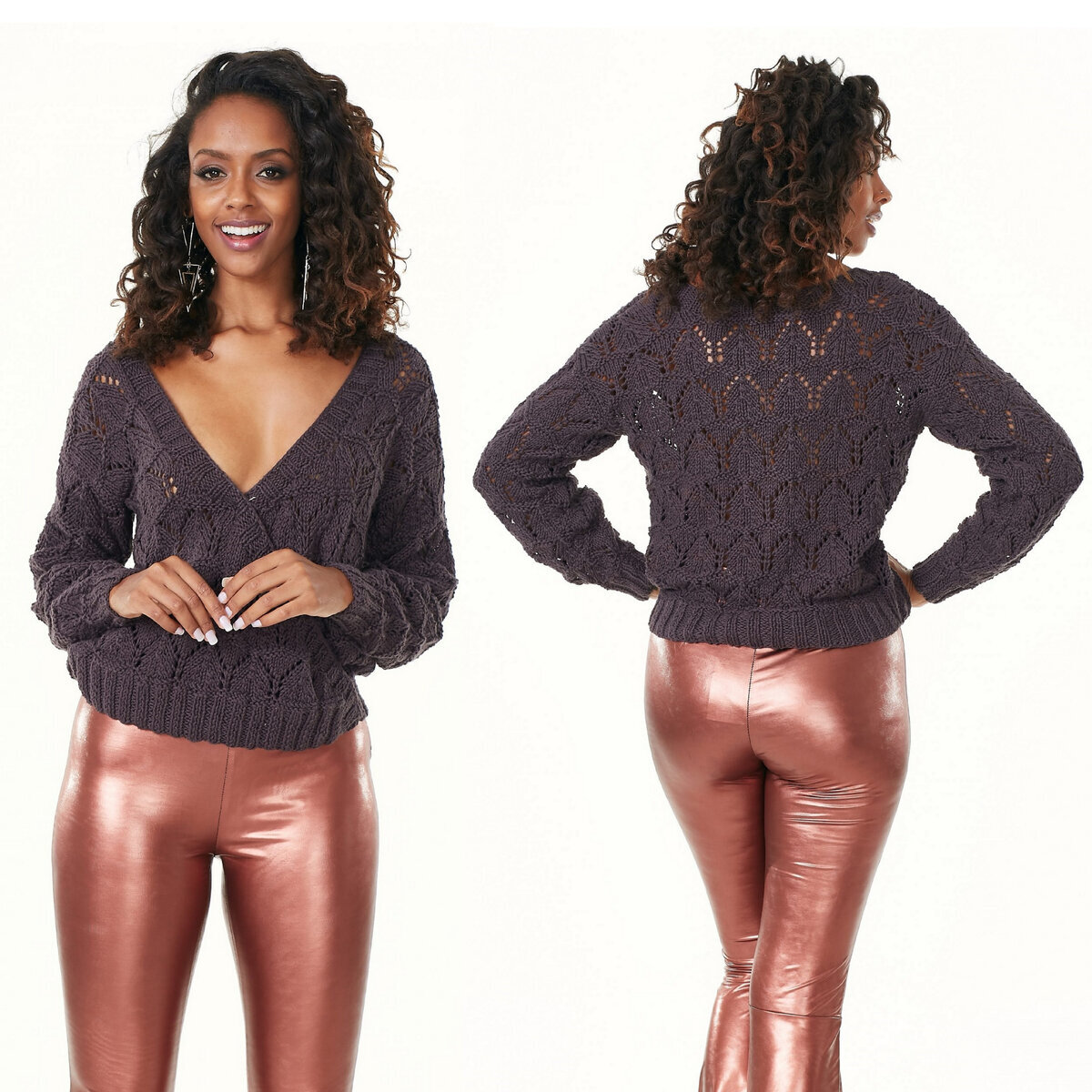Пуловер вяжется из трёх деталей, но при желании их можно связать все вместе и затем сшить запахивающиеся края. Кстати, можно не сшивать, а сделать с завязками на поясе — связать крючком или спицами пояс-шнурок. Главное, не забыть для него сделать отверстие, если решите вязать все детали вместе. Но если разрез выходит слишком большой и постоянно открывается зона декольте, то лучше всё же сшить края и слегка пришить с изнаночной стороны место стыка в районе декольте.
