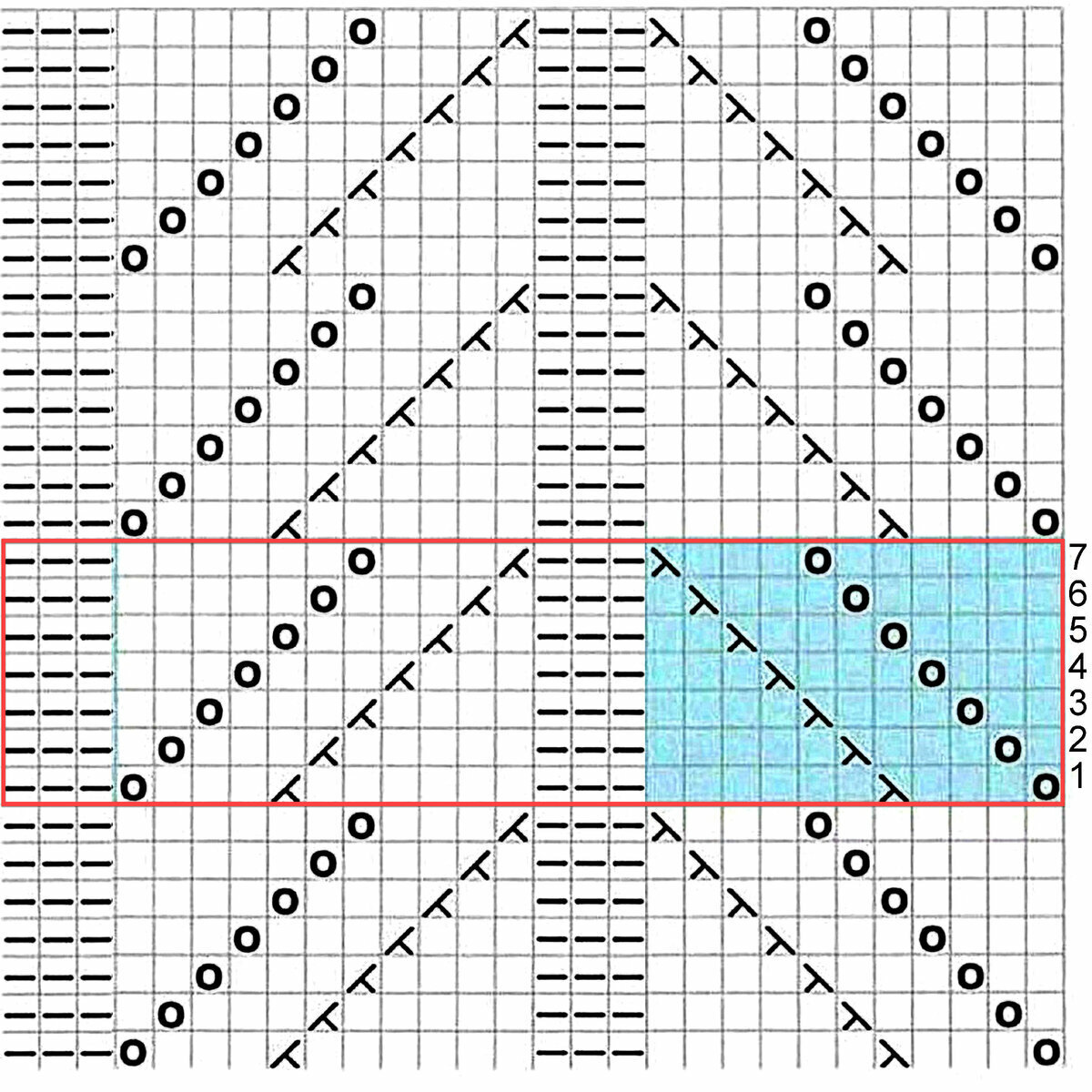 Раппорт основного узора всего 7 петель и 2 ряда в высоту. Схема для поворотного вязания, на ней указаны только лицевые ряды — для красивой симметрии узора рекомендуется добавить ещё 2 петли (если планируете вязать по кругу, добавлять эти петли не нужно):