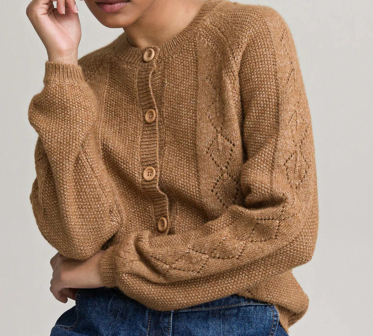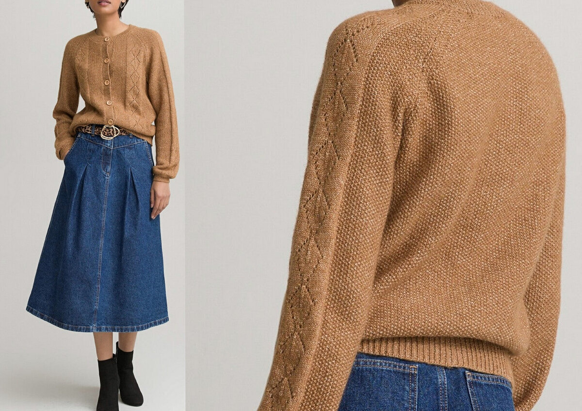 Элегантный кардиган спицами от Ла Редут цвета жжёного сахара с простыми узорами — основная часть (спинка полностью и вставки спереди и на рукавах) связана обычной рисовой путанкой. Впереди и по центру рукавов идут полосы с ажурными ромбами.