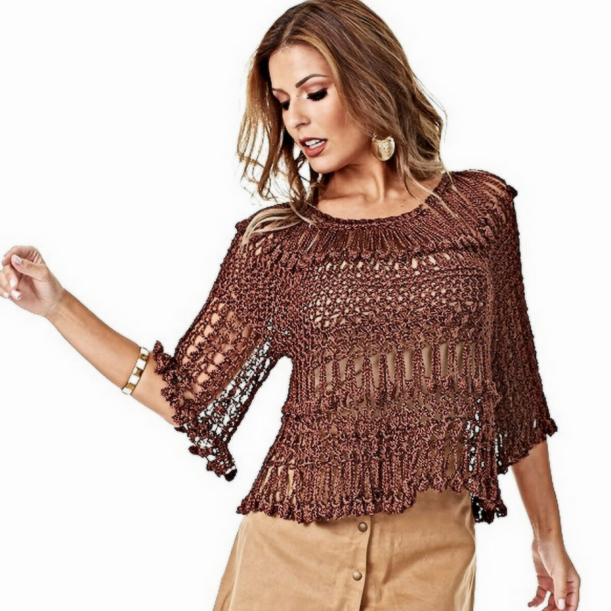 Нарядный золотисто-коричневый джемпер крючком с пышными рукавами-буфами. Облегающий низ на рельефной резинке и свободный верх. Втачной рукав, трапециевидный вырез горловины. Особую праздничность модели придаёт пряжа с люрексом!