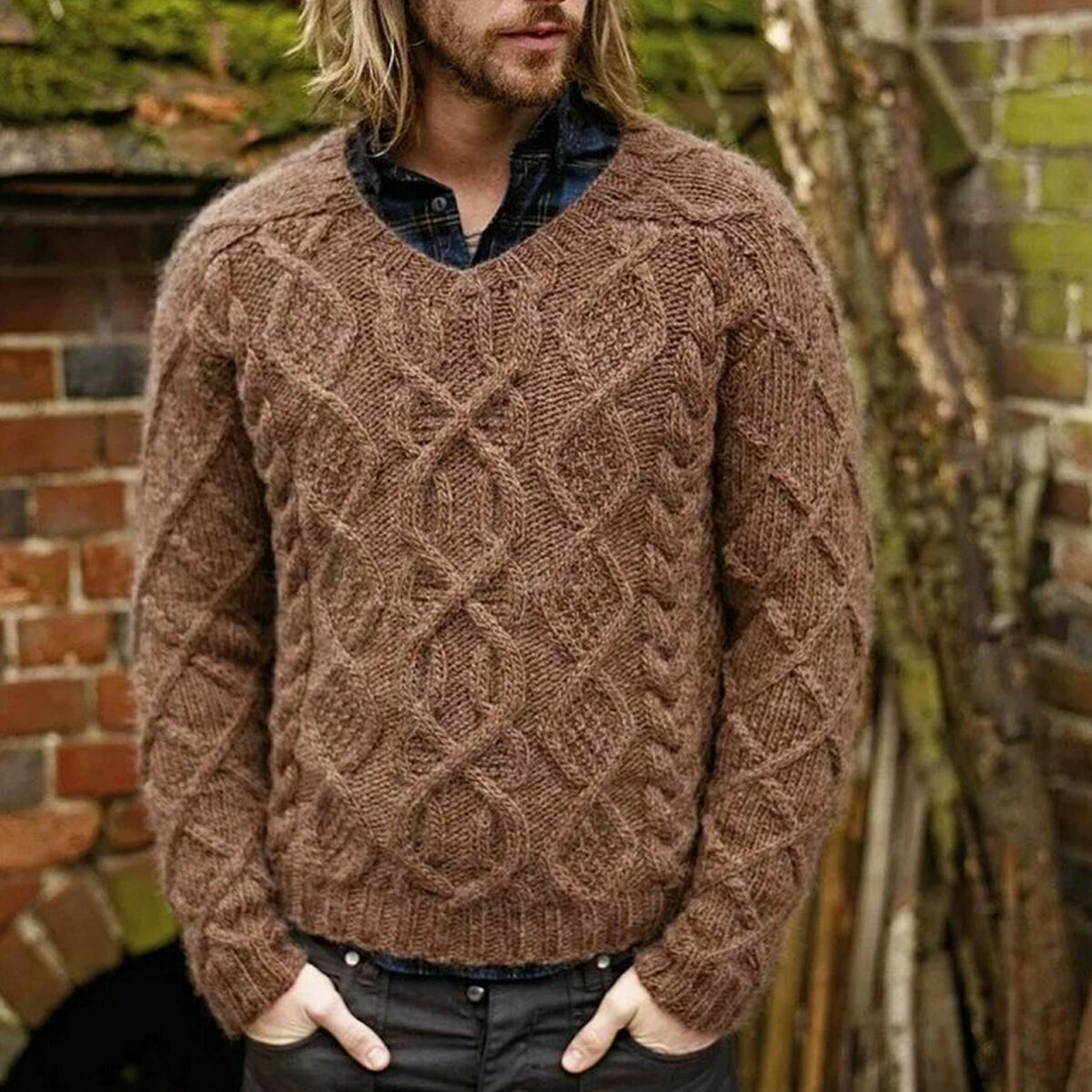 Интересная мужская модель спицами, необычный вариант реглана-погона — в такой интерпретации ещё не встречала. Не сразу поняла, что это за низкое плечо, пока не посмотрела на выкройку. Свежо!